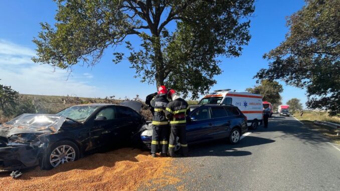 Pompierii Detașamentului Tulcea au intervenit astăzi, în apropiere de localitatea Mihail Kogălniceanu, pe DN 22, la un accident rutier în care au fost implicate două autoturisme și o autoutilitară încărcată cu porumb.