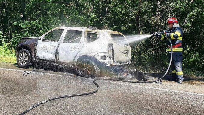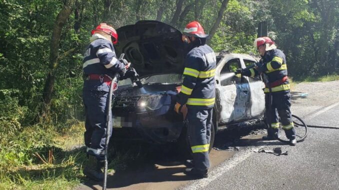 Autoturism cuprins de flăcări în apropiere de Babadag. FOTO ISU Tulcea
