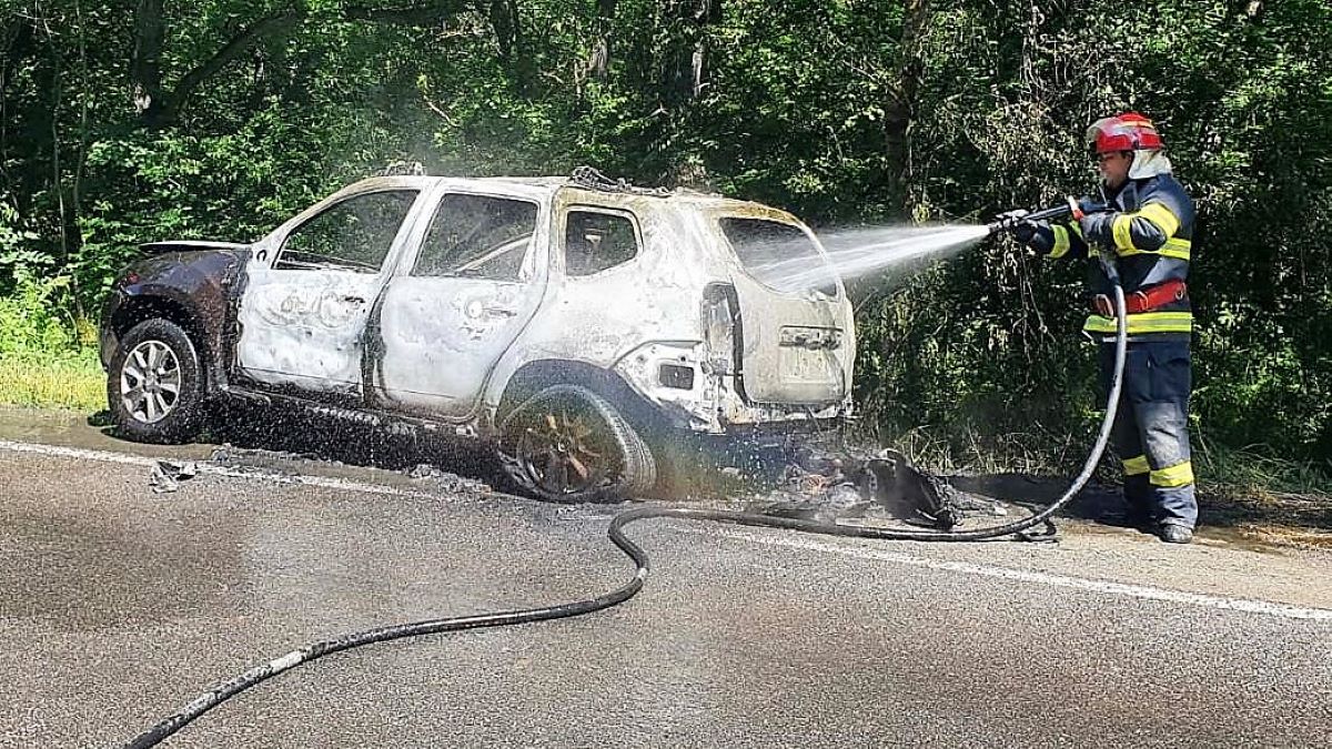 Autoturism cuprins de flăcări în apropiere de Babadag. FOTO ISU Tulcea