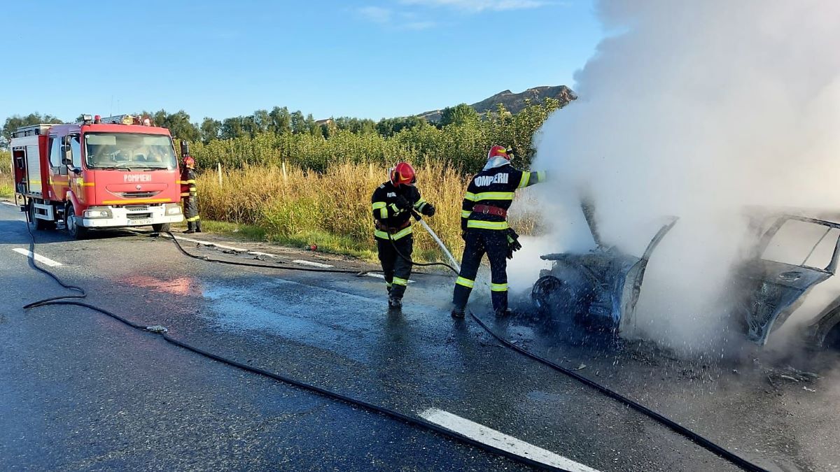 Autoturism în care se aflau și trei copii, cuprins de flăcări pe DN 22. FOTO: ISU Tulcea
