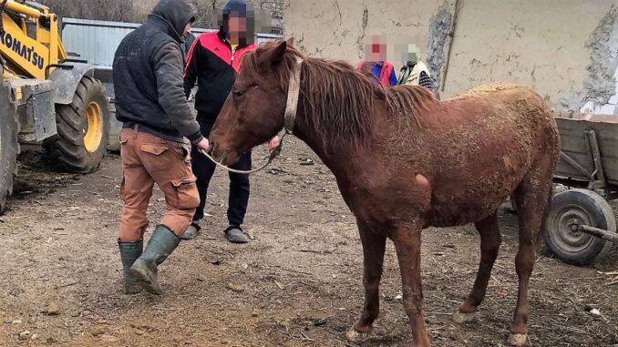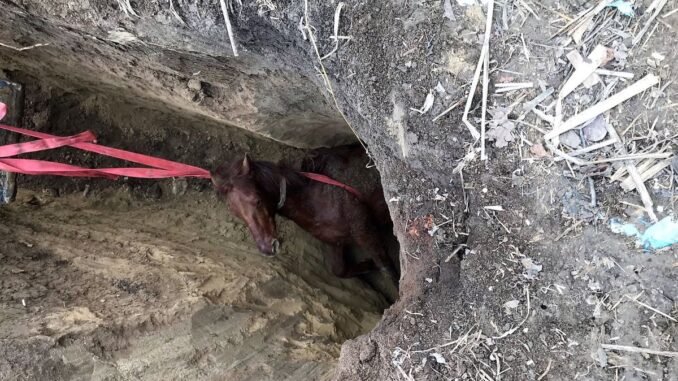 După aproximativ 40 de minute, calul a fost scos din groapă teafăr și nevătămat.
