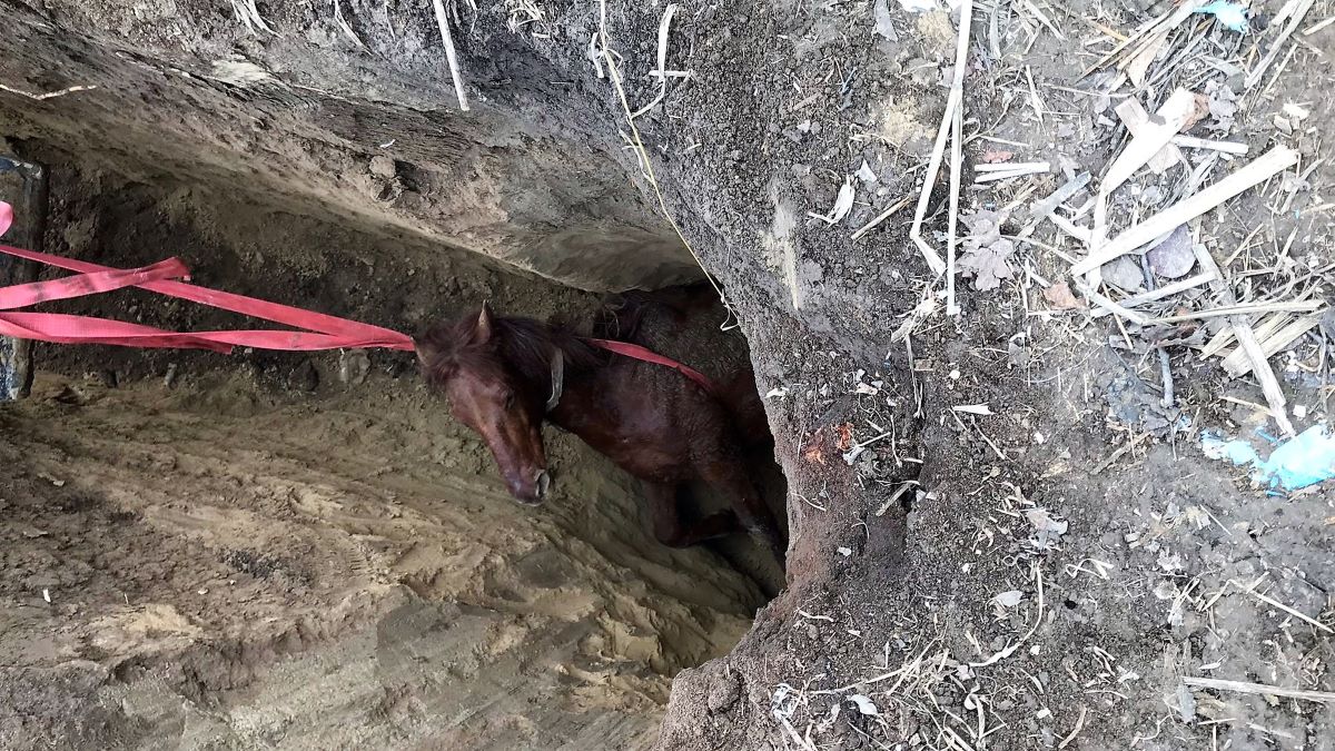 Cal salvat după ce căzuse într-o groapă adâncă de trei metri, în Văcăreni. FOTO ISU Tulcea