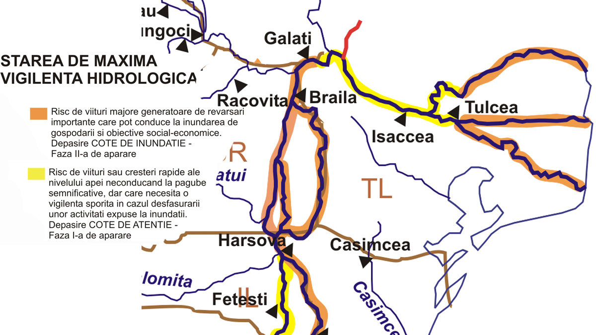 harta inundatii ISU Delta Tulcea a emis o avertizare privind creșteri de debite și niveluri cu depășirea cotelor de apărare