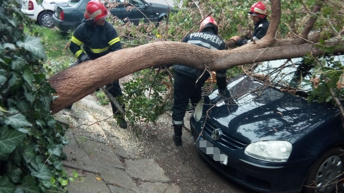 copac pe masina (2) Un copac s-a prăbușit peste o mașină, în municipiul Tulcea. FOTO ISU Delta Tulcea