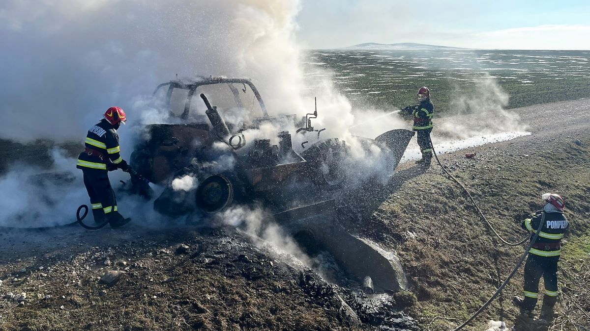 Excavator distrus de flăcări localitatea tulceană Mihail Kogălniceanu. FOTO: ISU Tulcea