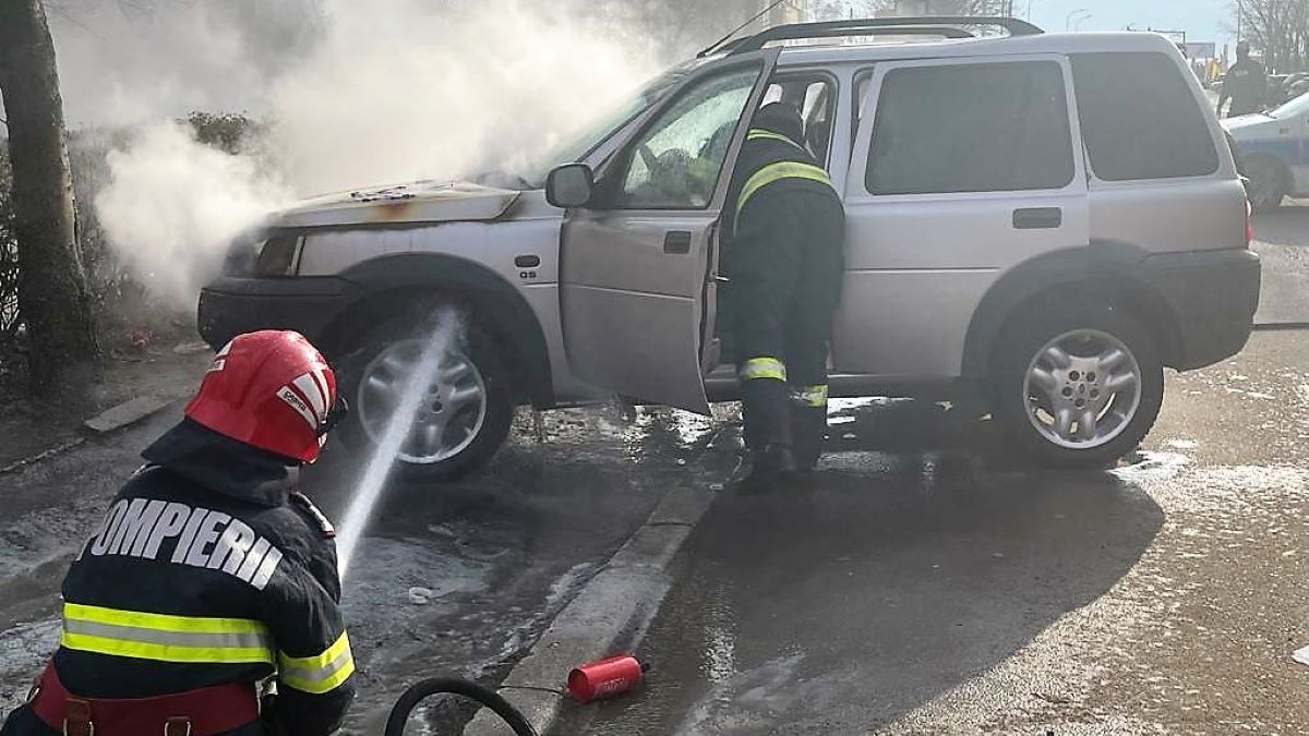 Autoturism parcat, distrus de flăcări pe o stradă din municipiul Tulcea. FOTO: ISU Tulcea