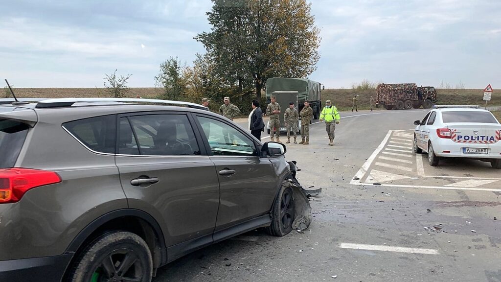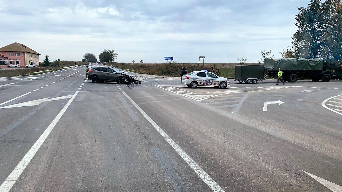 În accidentul rutier a fost implicat un autoturism SUV, care a acroșat un camion militar, ce se deplasa într-un convoi.