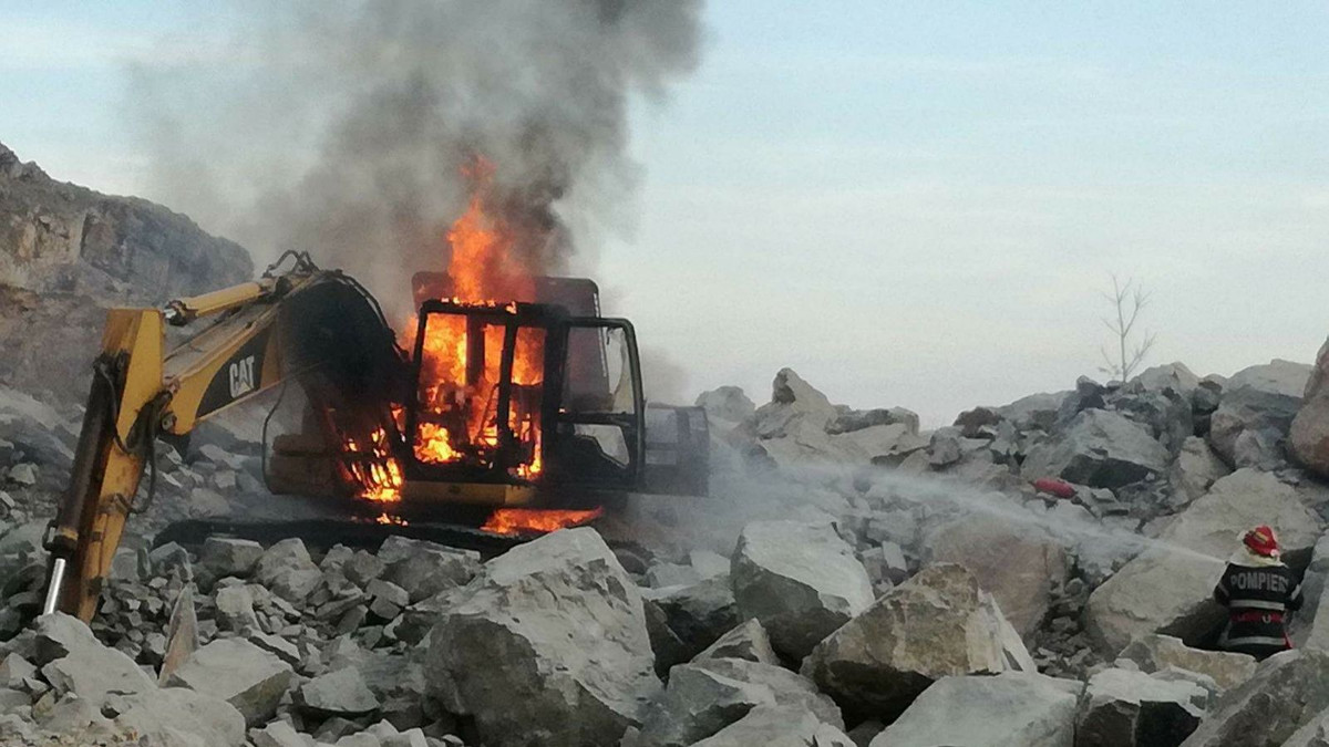 Incendiu Buldoexcavator cariera Macin (2) Pompierii din stația Măcin au intervenit pentru a stinge incendiul izbucnit la un utilaj din carieră. FOTO ISU Delta