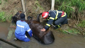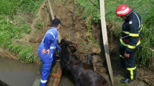 Pompierii tulceni au fost solicitați pentru salvarea unui cal căzut într-un pârâu. FOTO ISU Delta Tulcea