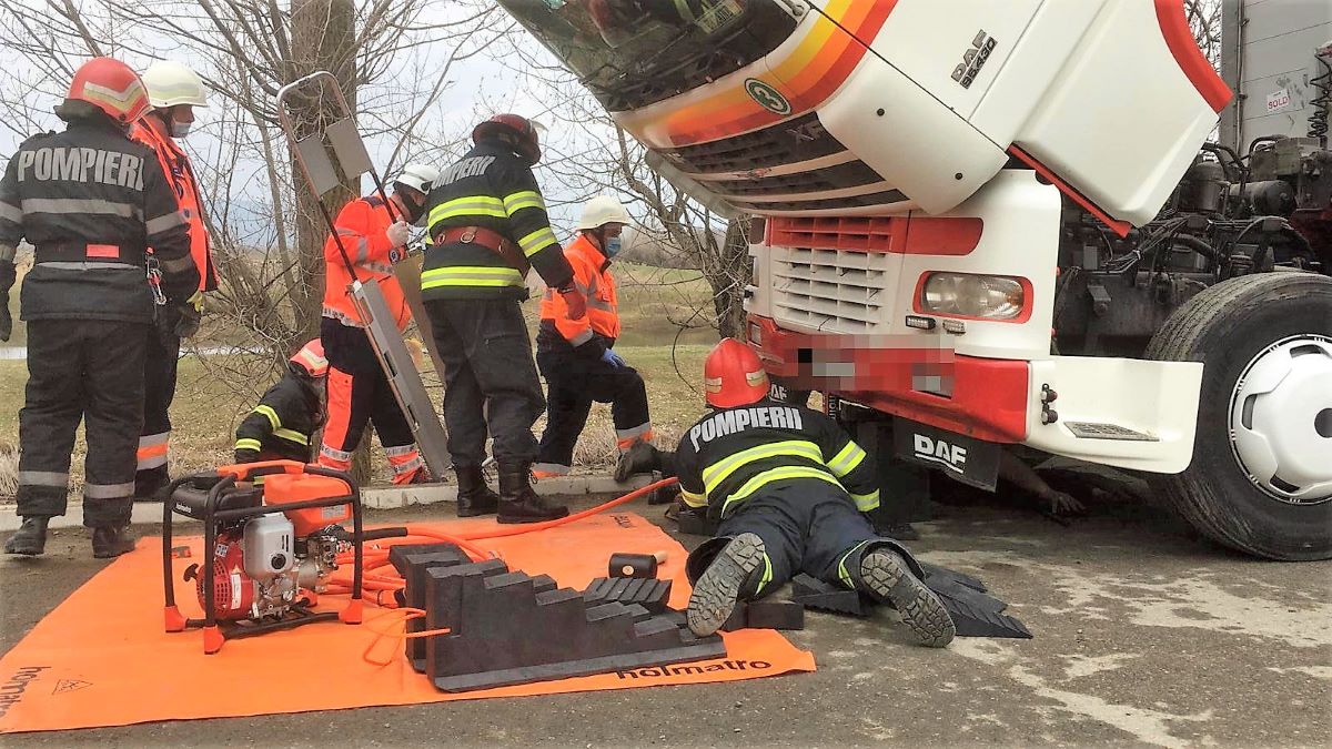 Șofer de TIR ucrainean, salvat de pompieri după ce a rămas captiv sub autotren. FOTO ISU Tulcea