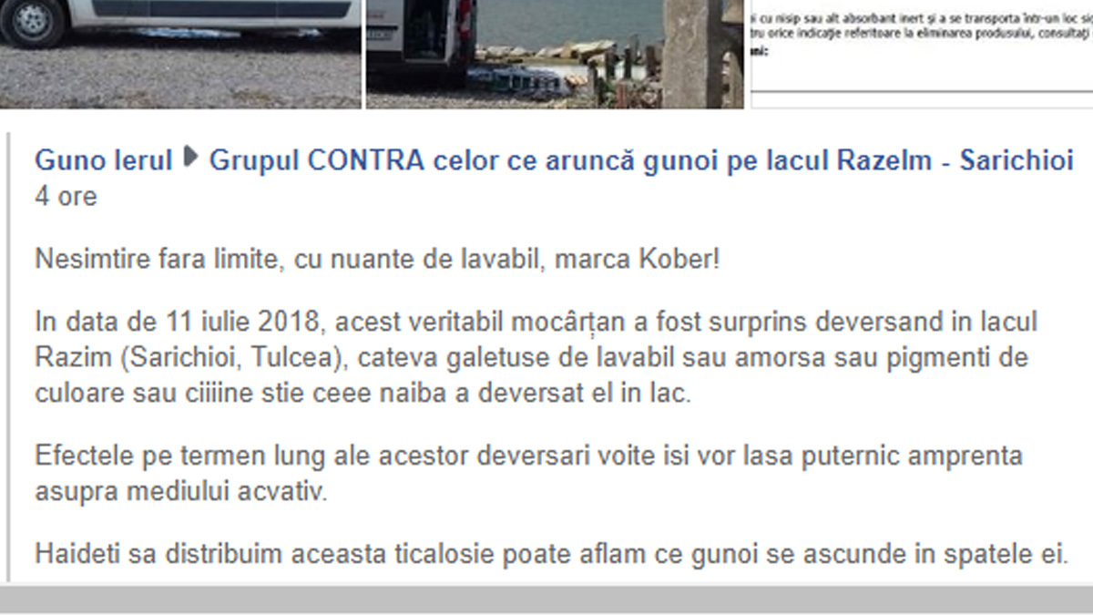 În fotografiile postate în mediul online se vede o autoutilitară Fiat, inscripționată „Kober“ – NT 63 KOB, parcată pe malul lacului Razim, pe raza localității Sarichioi. Lângă autoutilitară se văd câteva găleți cu produse Kober, iar apa la mal este vizibil poluată cel mai probabil cu var. De asemenea, în fotografii se observă cum o persoană se află în interiorul autoutilitarei și cel mai probabil spală conținutul unor găleți. Pe gălețile cu produse Kober se specifică faptul că acestea sunt toxice și să se evite deversarea lor în mediul ambient.