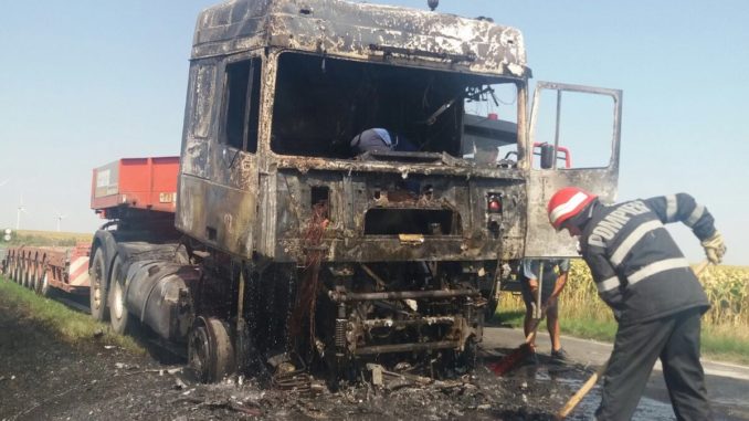 Un camion, mistuit de flăcări la Topolog. FOTO ISU Delta