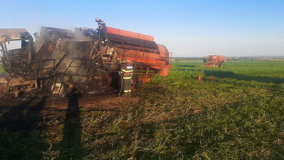 Un utilaj agricol a fost distrus într-un incendiu, în apropiere de Sarichioi. FOTO ISU Tulcea