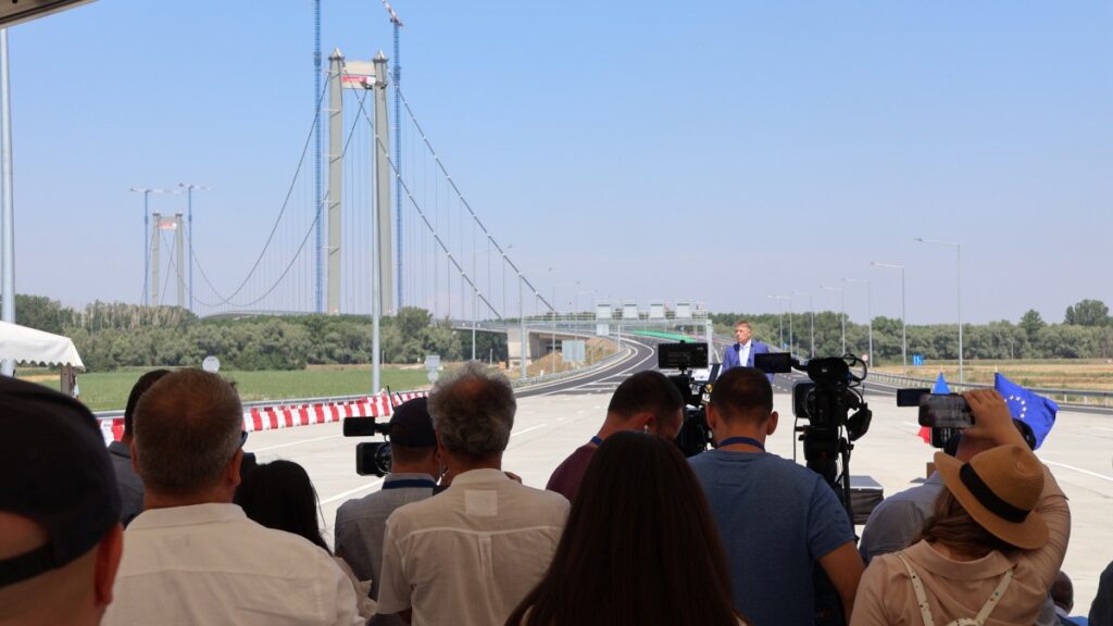 Președinte Klaus Iohannis a spus că este vorba de cea mai amplă construcție ridicată în România în ultimele trei decenii și al treilea pod ca mărime din Europa.