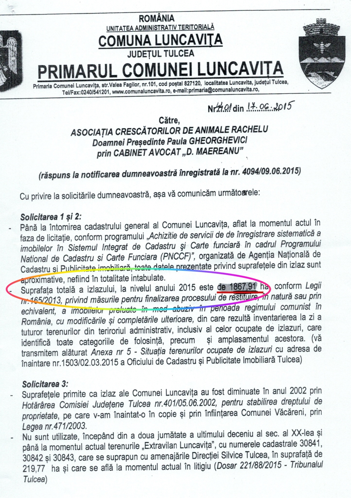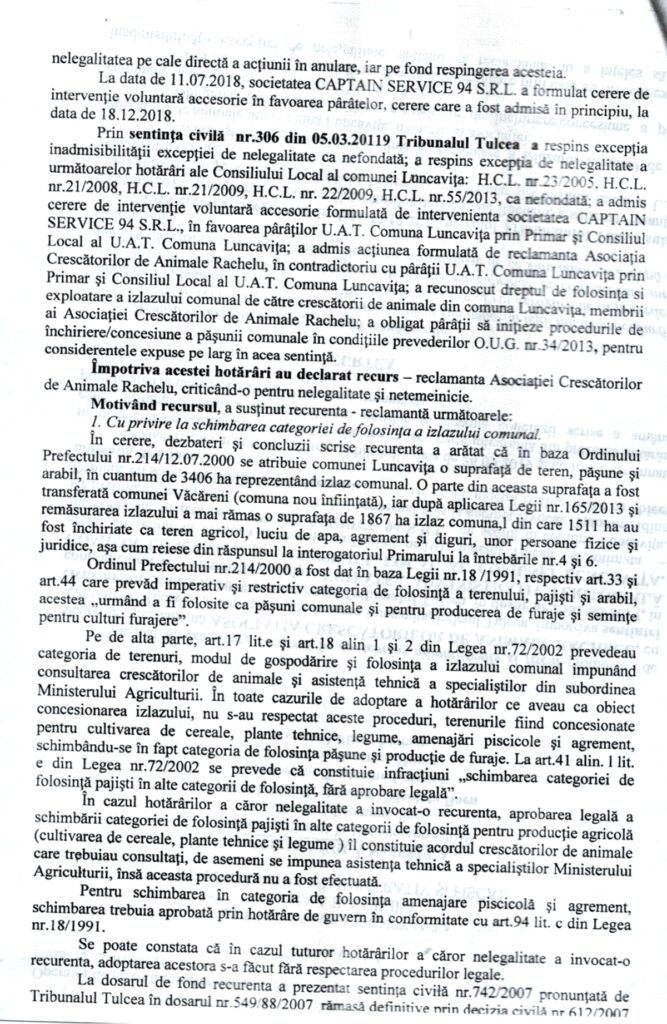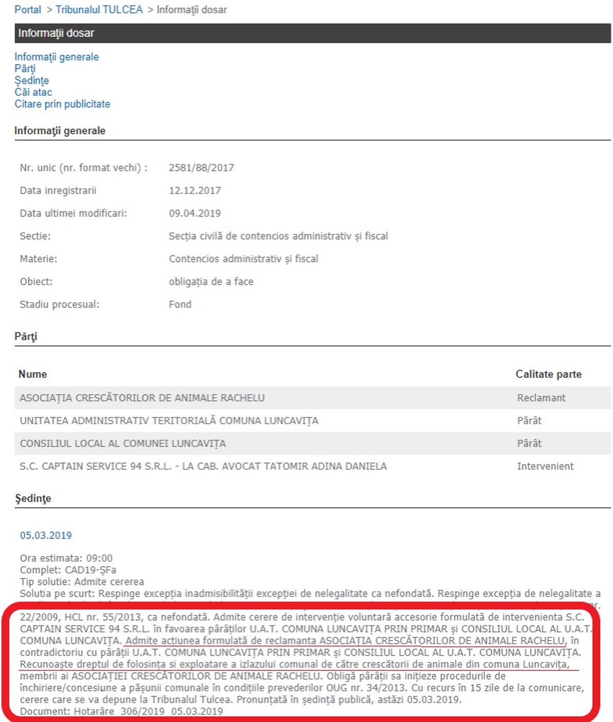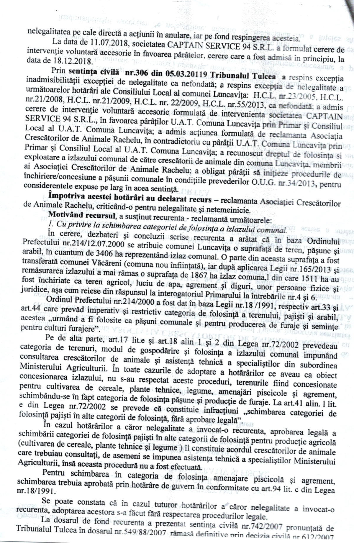 Totuși, ceea ce a omis primarul demisionar Ștefan Ilie este faptul că, anul trecut, Instanța a admis acțiunea formulată de Asociație, prin care se „recunoaşte dreptul de folosinţa si exploatare a izlazului comunal de către crescătorii de animale din comuna Luncaviţa, membrii ai Asociației Crescătorilor de Animale Rachelu” și “obligă pârâţii (n.r.: U.A.T. COMUNA LUNCAVIŢA PRIN PRIMAR şi CONSILIUL LOCAL AL U.A.T. COMUNA LUNCAVIŢA) să iniţieze procedurile de închiriere/concesiune a păşunii comunale în condiţiile prevederilor OUG nr. 34/2013”.