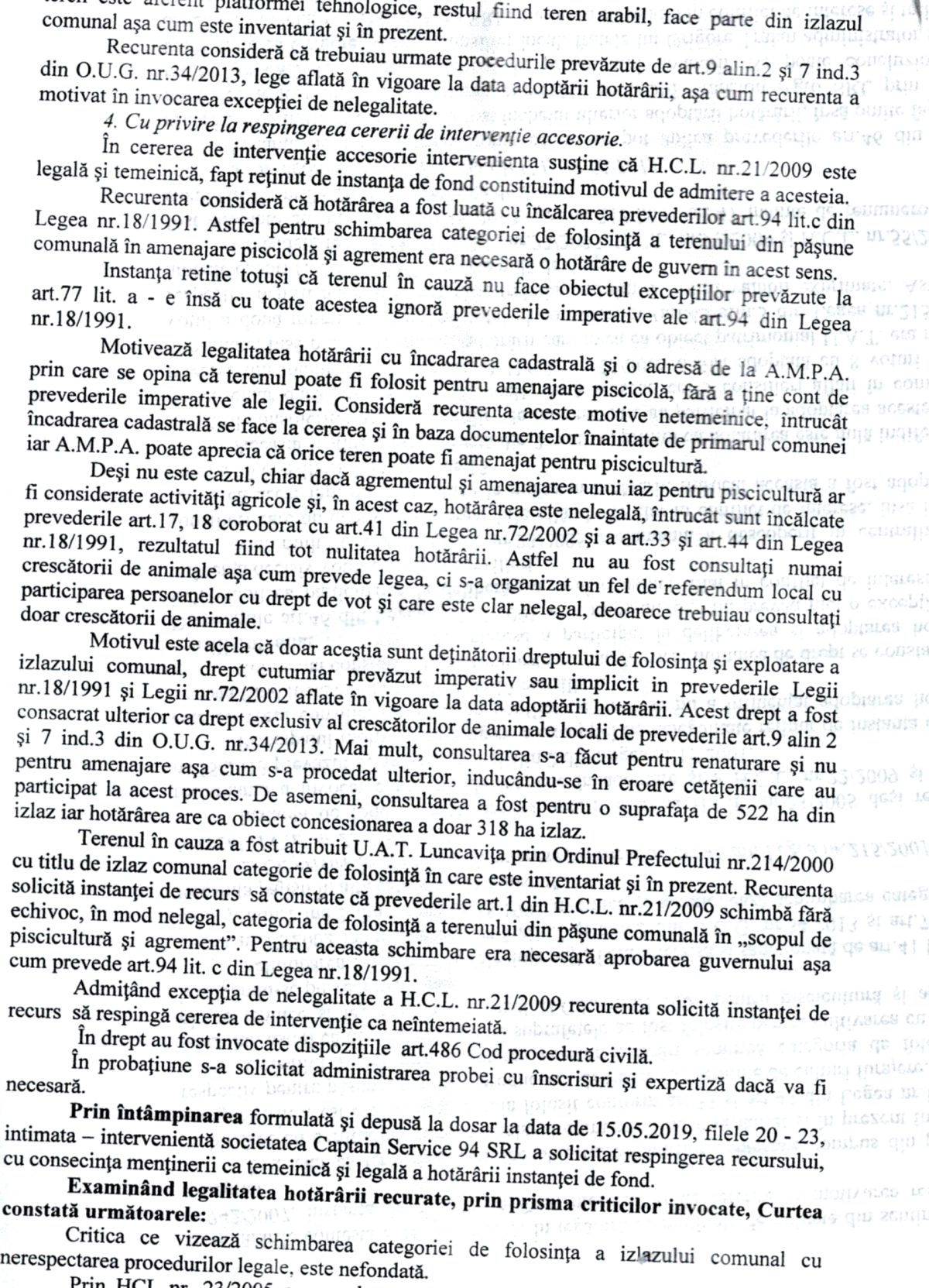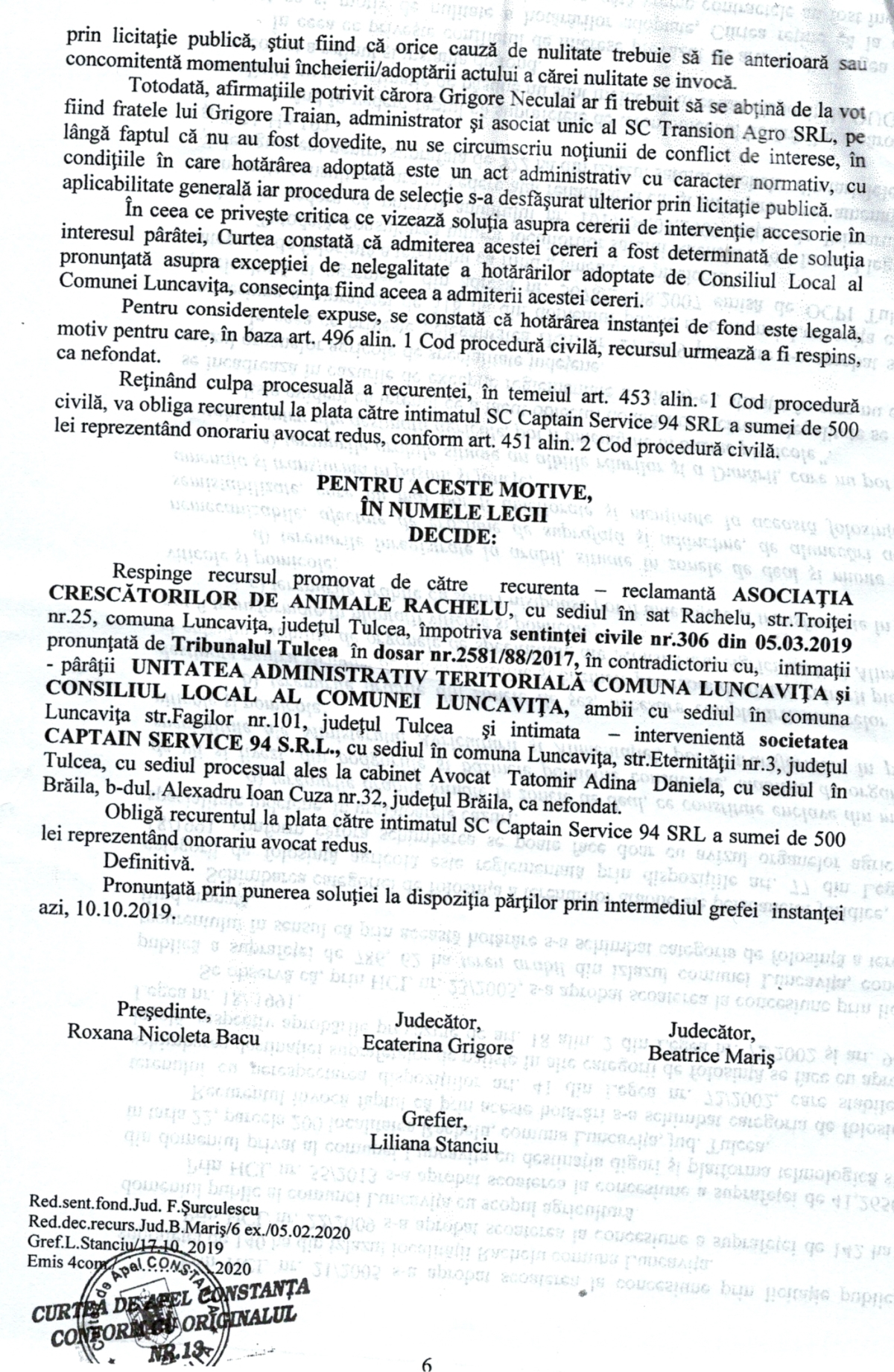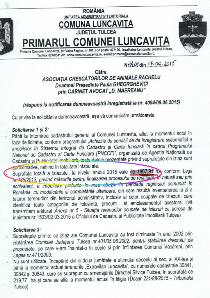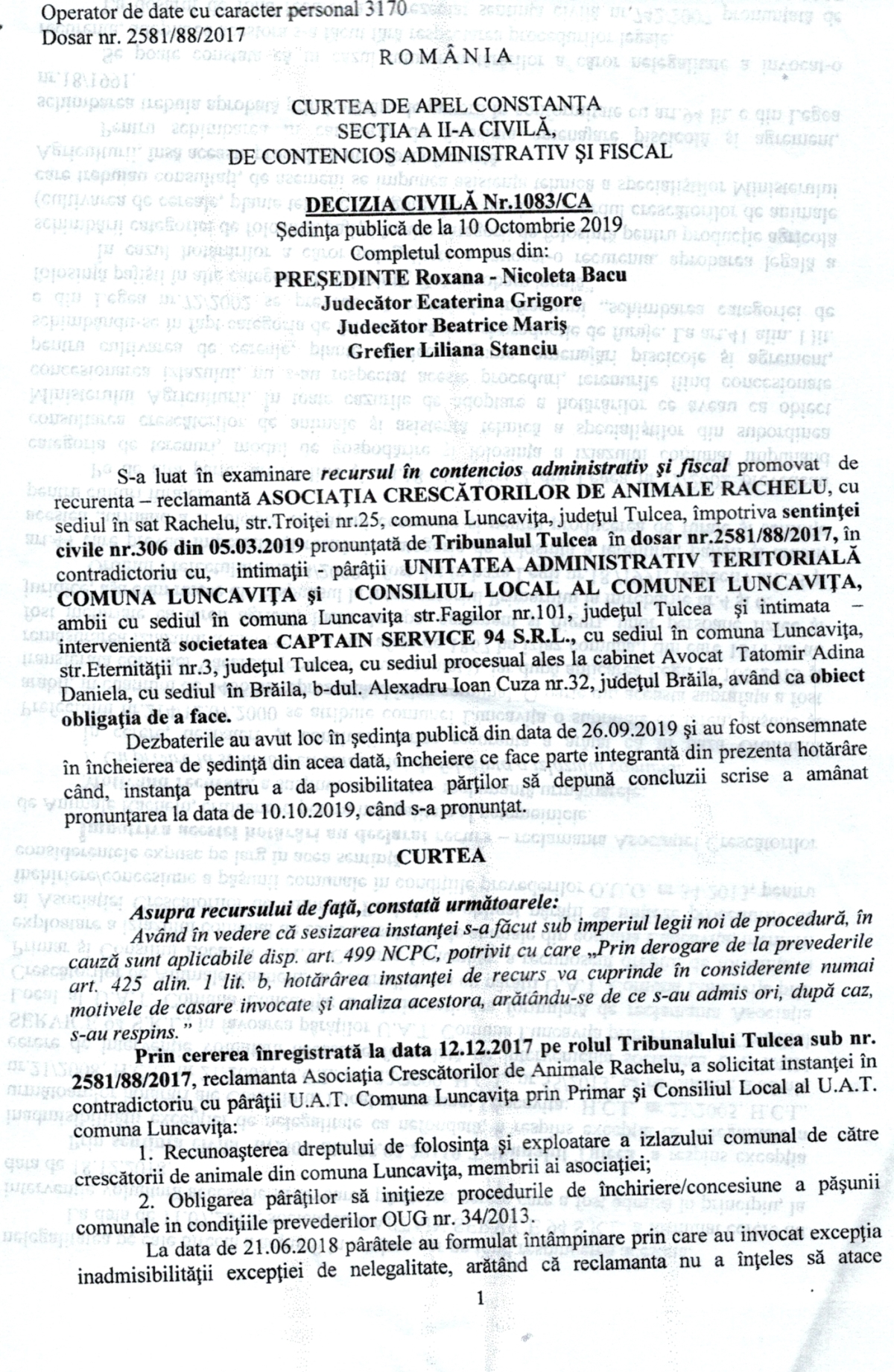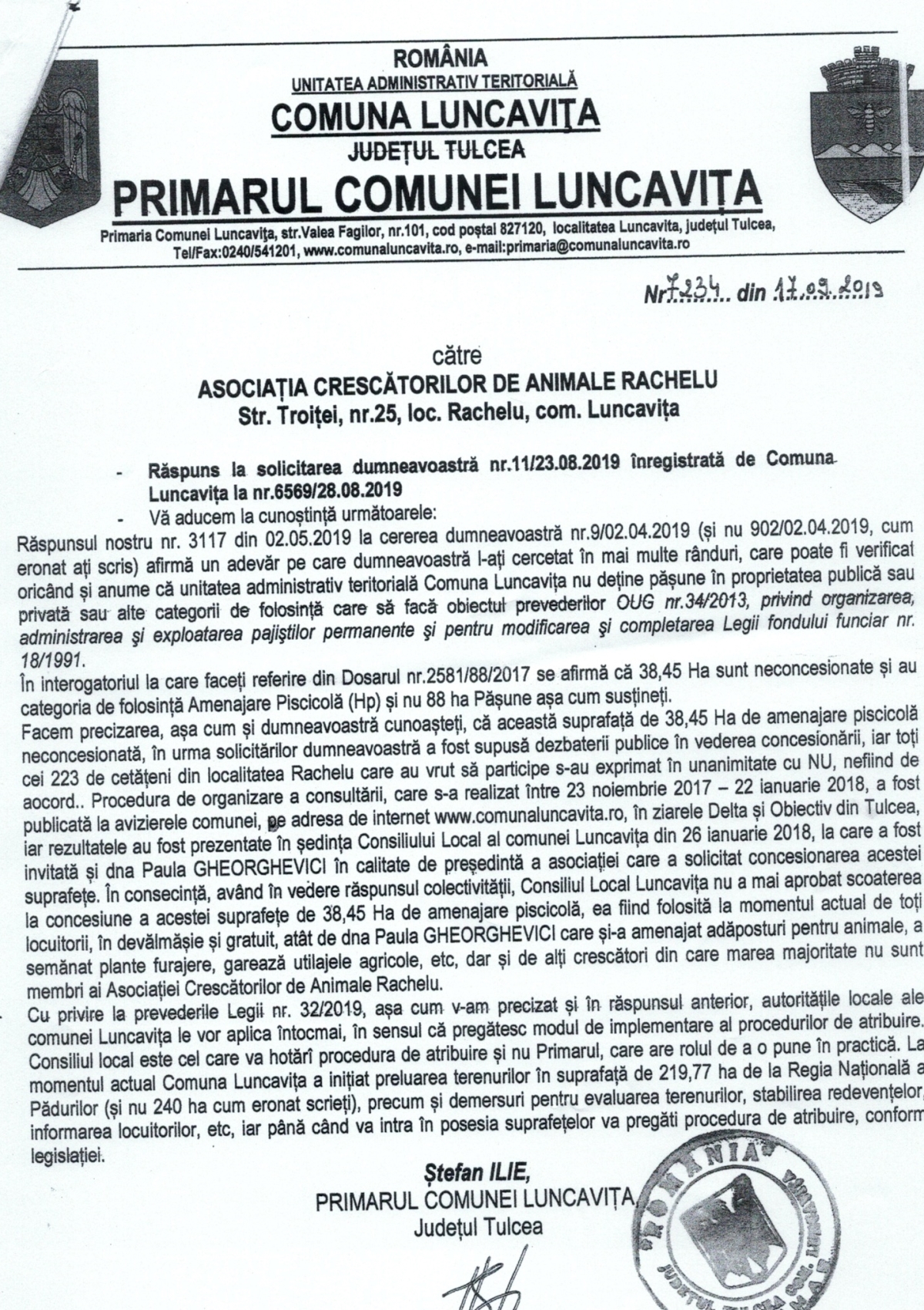 Totuși, ceea ce a omis primarul demisionar Ștefan Ilie este faptul că, anul trecut, Instanța a admis acțiunea formulată de Asociație, prin care se „recunoaşte dreptul de folosinţa si exploatare a izlazului comunal de către crescătorii de animale din comuna Luncaviţa, membrii ai Asociației Crescătorilor de Animale Rachelu” și “obligă pârâţii (n.r.: U.A.T. COMUNA LUNCAVIŢA PRIN PRIMAR şi CONSILIUL LOCAL AL U.A.T. COMUNA LUNCAVIŢA) să iniţieze procedurile de închiriere/concesiune a păşunii comunale în condiţiile prevederilor OUG nr. 34/2013”.