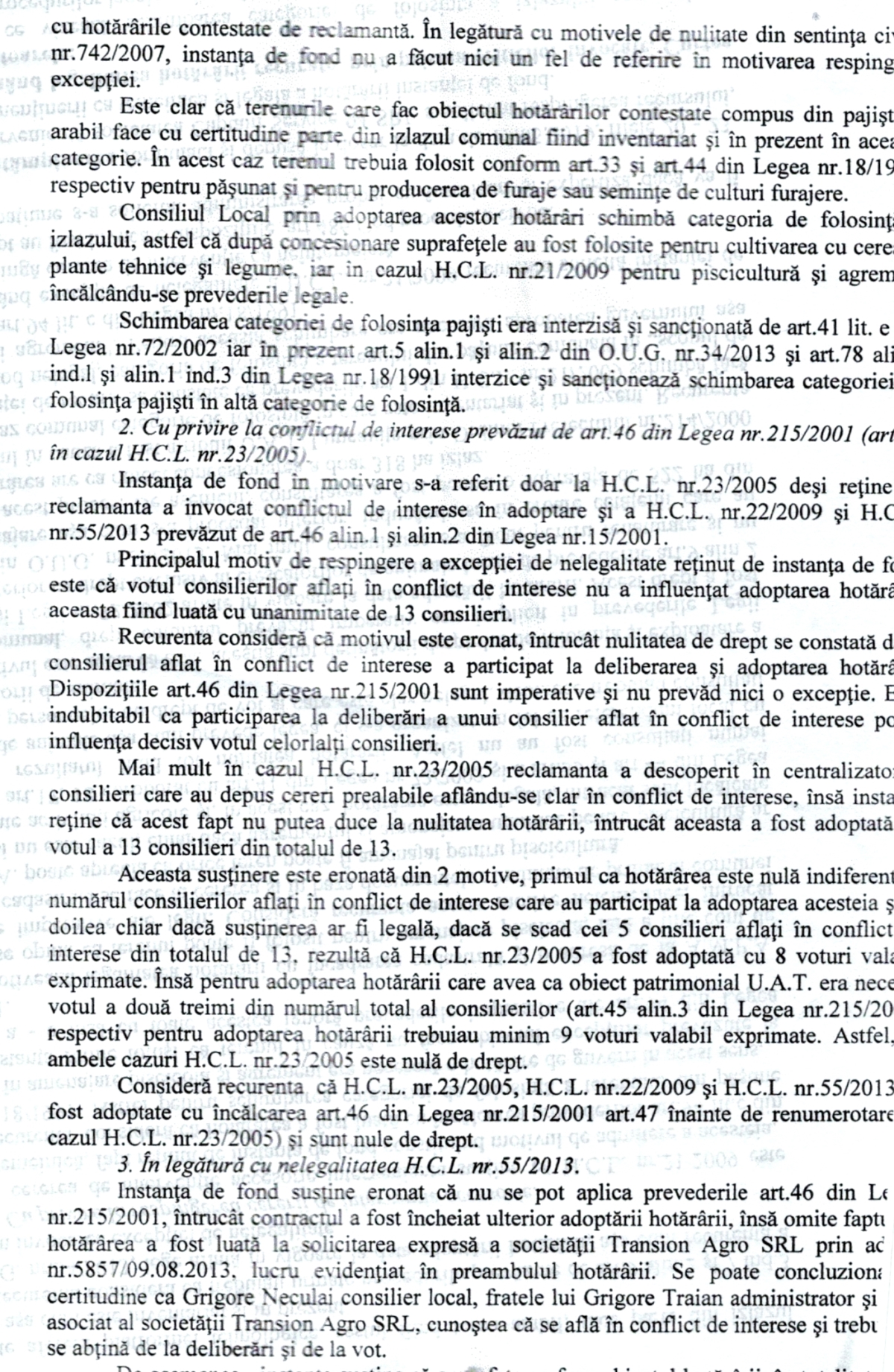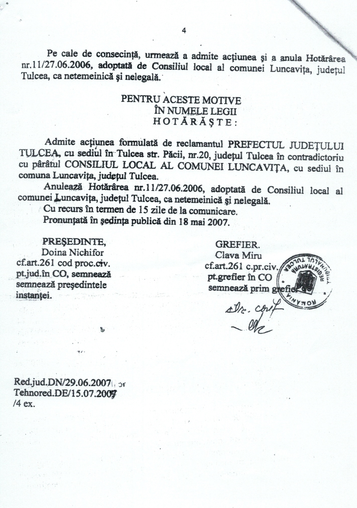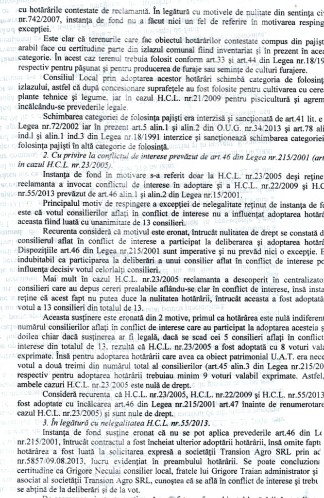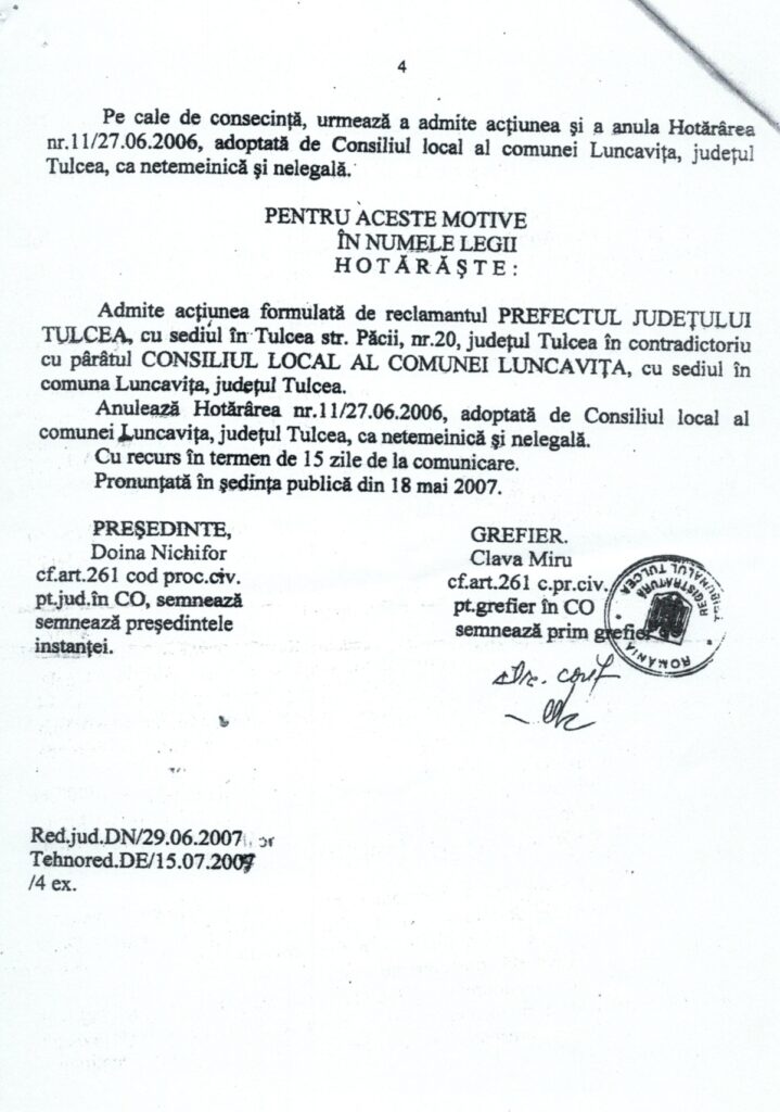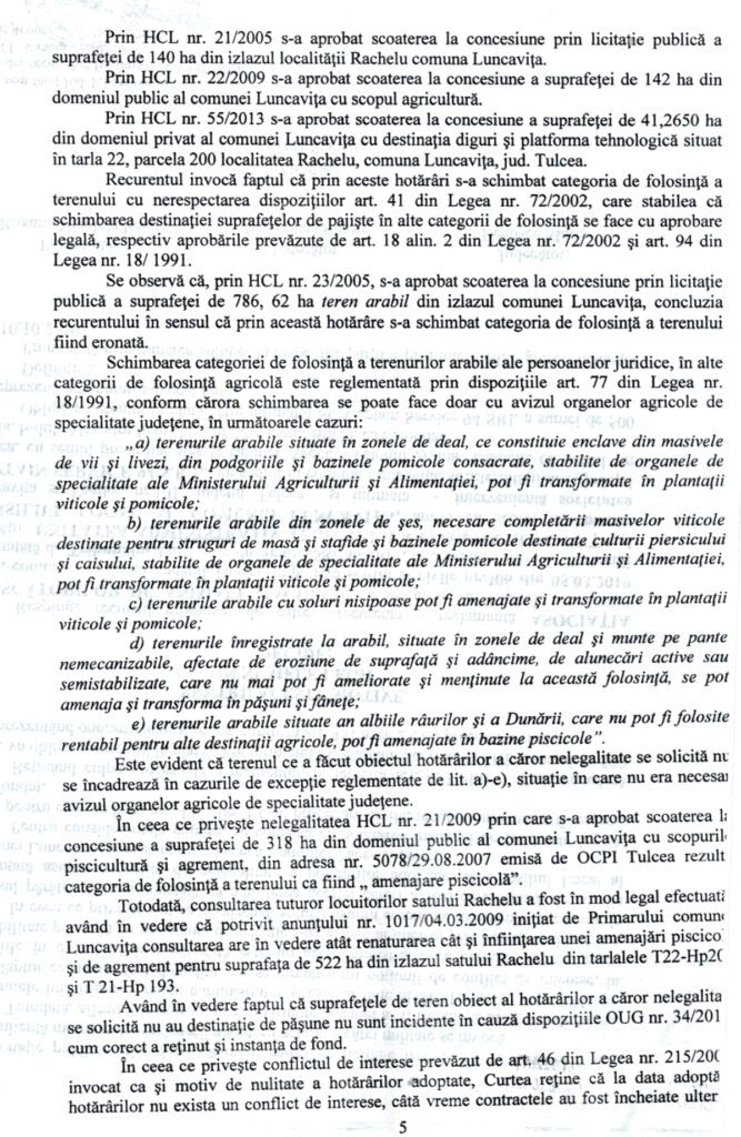 Totuși, ceea ce a omis primarul demisionar Ștefan Ilie este faptul că, anul trecut, Instanța a admis acțiunea formulată de Asociație, prin care se „recunoaşte dreptul de folosinţa si exploatare a izlazului comunal de către crescătorii de animale din comuna Luncaviţa, membrii ai Asociației Crescătorilor de Animale Rachelu” și “obligă pârâţii (n.r.: U.A.T. COMUNA LUNCAVIŢA PRIN PRIMAR şi CONSILIUL LOCAL AL U.A.T. COMUNA LUNCAVIŢA) să iniţieze procedurile de închiriere/concesiune a păşunii comunale în condiţiile prevederilor OUG nr. 34/2013”.