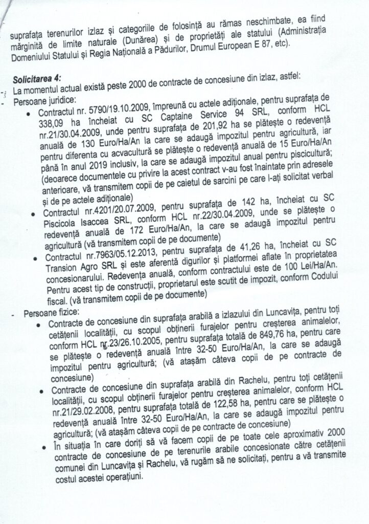 “Noi, dacă luăm în concesiune o bucată de pământ de la primărie, plătim de la 10 la 400 euro, ca oameni de rând. Domnului Abdul (n.r.: un investitor din zonă, care a primit o mare suprafață din fostul islaz, pe care a transformat-o în teren piscicol și de agrement) i s-au făcut mereu reduceri și <n> acte adiționale, din două în două săptămâni, iar asta o putem dovedi cu acte, i s-a redus redevența că ar fi pescuit sportiv, dar nu-i nici pe departe… Totul s-a transformat în agricultură. Un teren pe care domnul Abdul plătește 5 euro pe hectar, redus prin act adițional, că ar face investiții. Dacă din 2009, de când a primit terenul, s-ar fi făcut vreo investiție, s-ar vedea…”, afirmă Paula Gheorghevici.