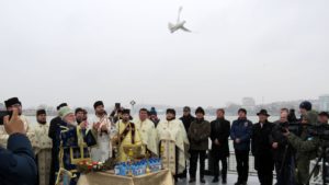 În prezența unui sobor de preoți condus de Prea Sfinția Sa Visarion Bălțat, Episcopul Tulcii, și a altor oficialități de la nivel municipal și județean, precum și a unei mase mari de credincioși strânși pe faleza municipiului, a fost săvârșit ceremonialul de sfințire a apelor, urmată de eliberarea unui porumbel alb, ca simbol al prezenței Duhului Sfânt.