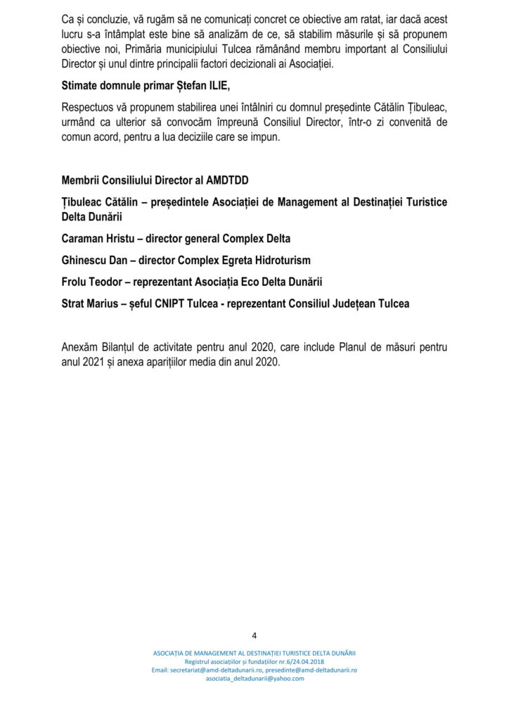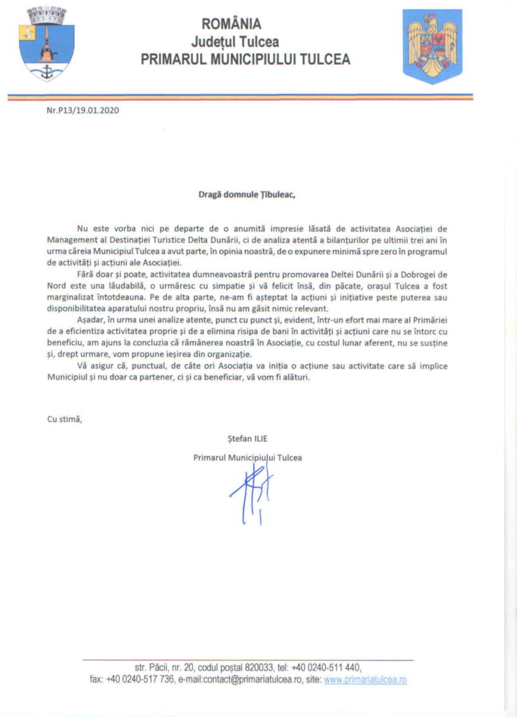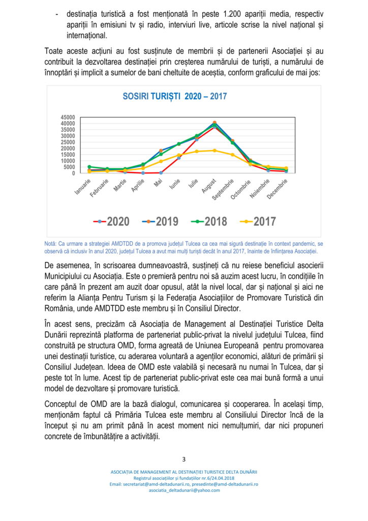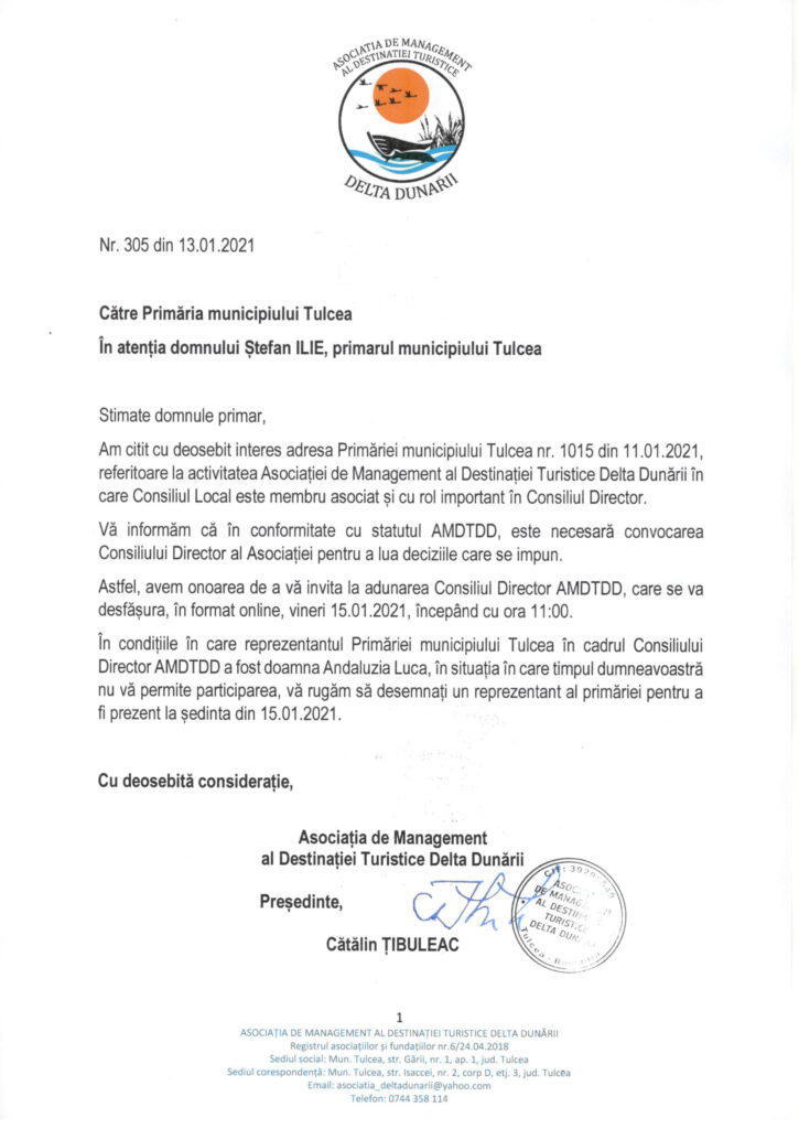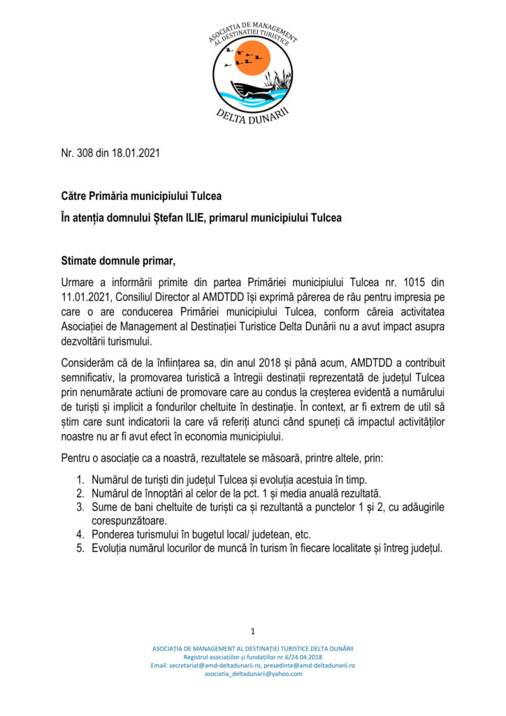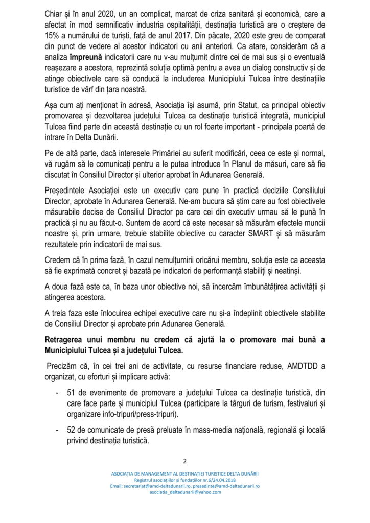 În acest sens, precizăm că Asociația de Management al Destinației Turistice Delta Dunării reprezintă platforma de parteneriat public-privat la nivelul județului Tulcea, fiind construită pe structura OMD, forma agreată de Uniunea Europeană pentru promovarea unei destinații turistice, cu aderarea voluntară a agenților economici, alături de primării și Consiliul Județean.