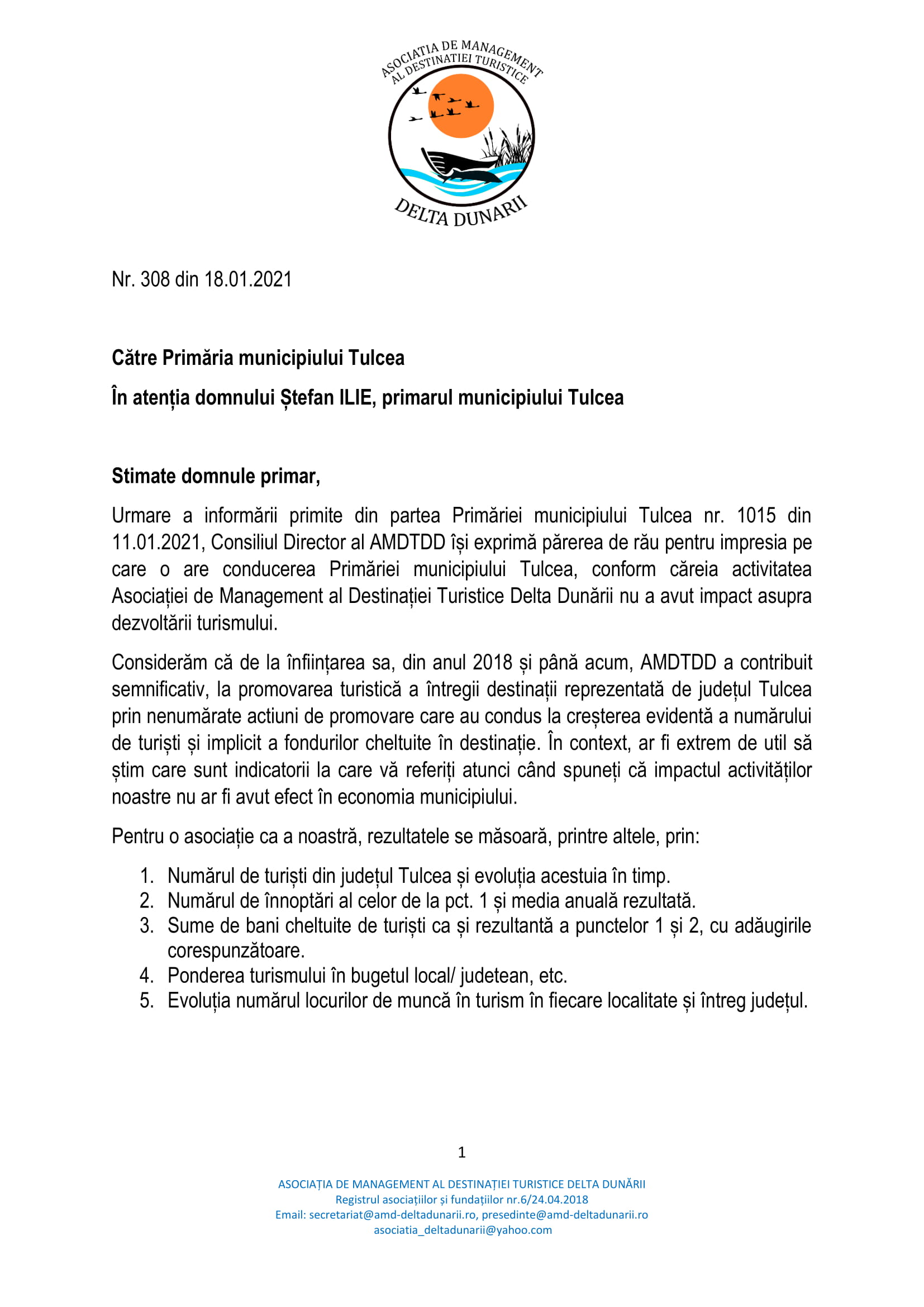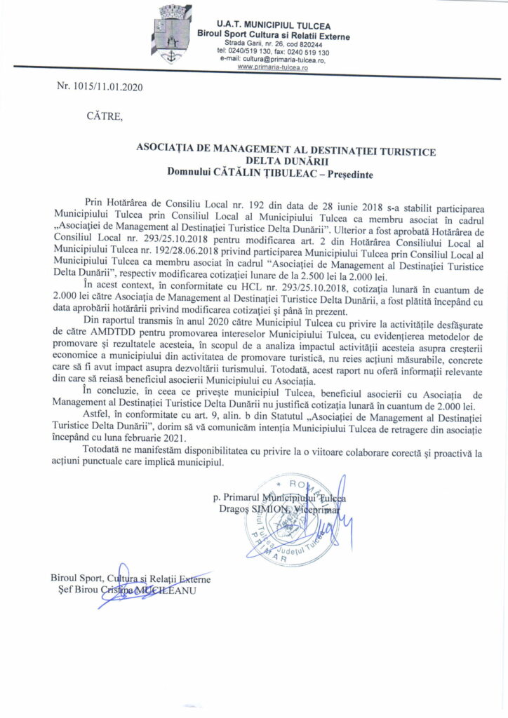 Decizia de a retrage Municipiul Tulcea din AMDTDD este surprinzătoare, având în vedere beneficiile de imagine pe care Municipiul Tulcea le-a avut și le poate avea și în viitor în urma apartenenței la AMDTDD. În cei trei ani de la înființare, asociația a reușit să promoveze județul Tulcea, Delta Dunării și, implicit, Municipiul Tulcea (principala poartă de acces în Delta Dunării), ca destinație turistică, atât pe plan național, cât și internațional.