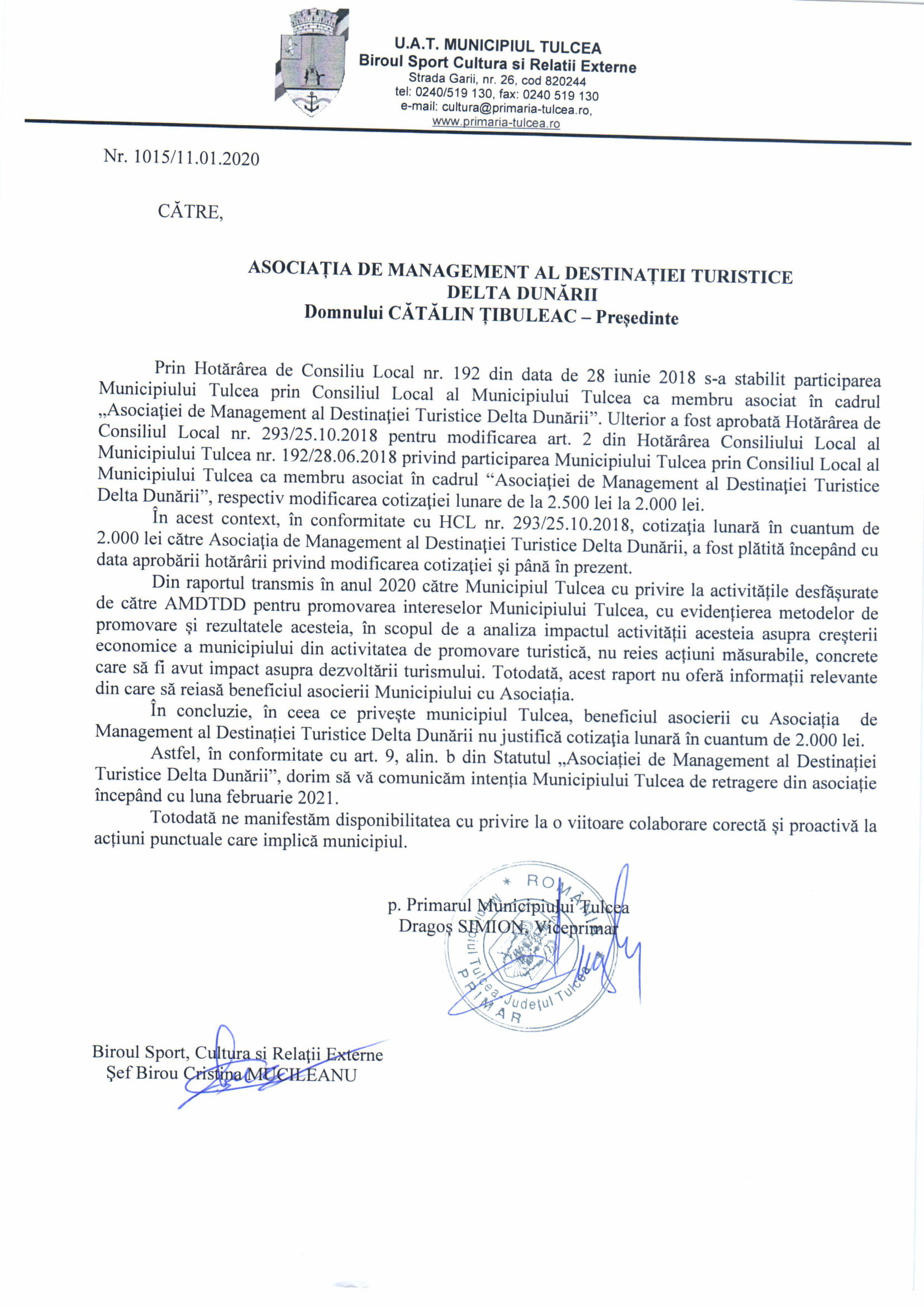 Un “argument forte” demontat încă din startul discuțiilor, când Andaluzia Luca, consilier local și reprezentant al Consiliului Local Tulcea în consiliul de conducere al AMDTDD, a menționat că a primit propunerea ca Primăria Municipiului Tulcea să rămână în continuare membru al asociației, cu scutirea de la plata cotizației pe durata următorului an. O perioadă în care reprezentanții primăriei să vină cu propuneri concrete, care să ducă la o și mai bună promovare a imaginii orașului reședință de județ.