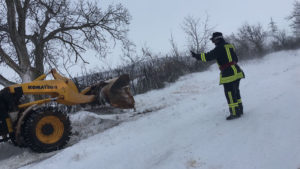 În zona Cataloi s-a format un dop de zăpadă care nu poate fi străpuns cu tot efortul depus. FOTO ISU Delta Tulcea