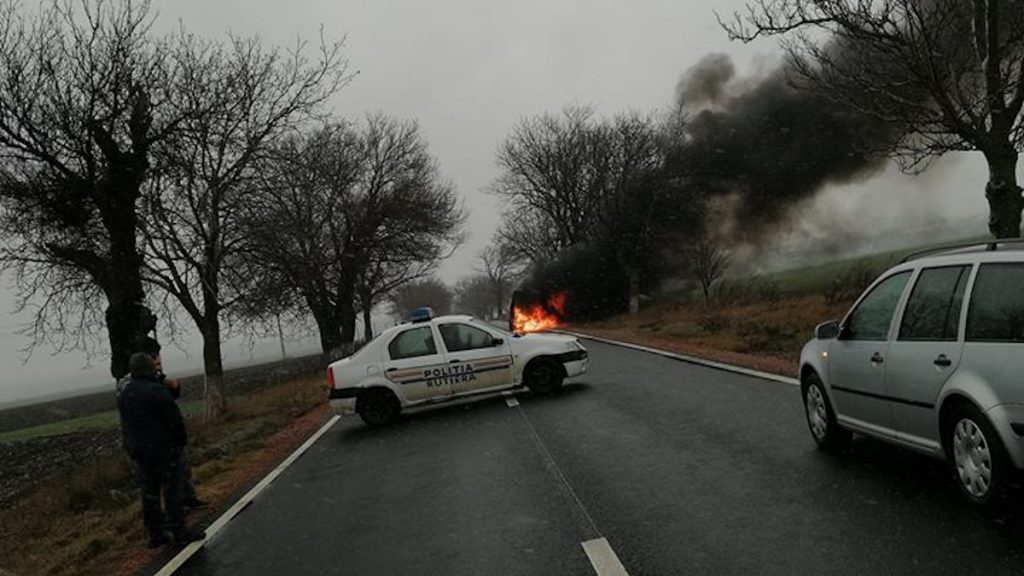 Poliția a oprit circulația în zona unde ardea mașina. FOTO IPJ Tulcea