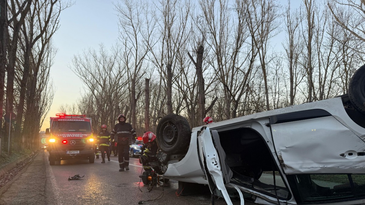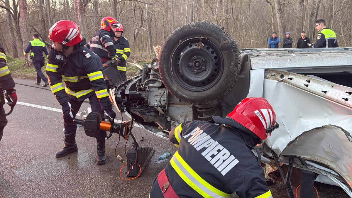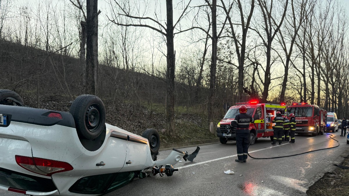 Pompierii tulceni au intervenit, miercuri, după ce o mașină s-a răsturnat, iar în autoturism se aflau trei persoane.