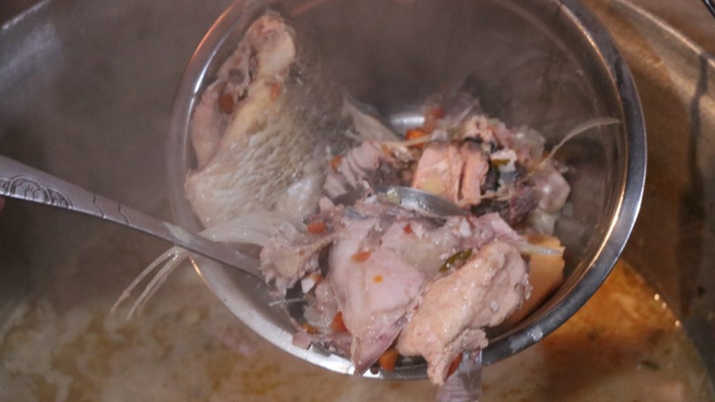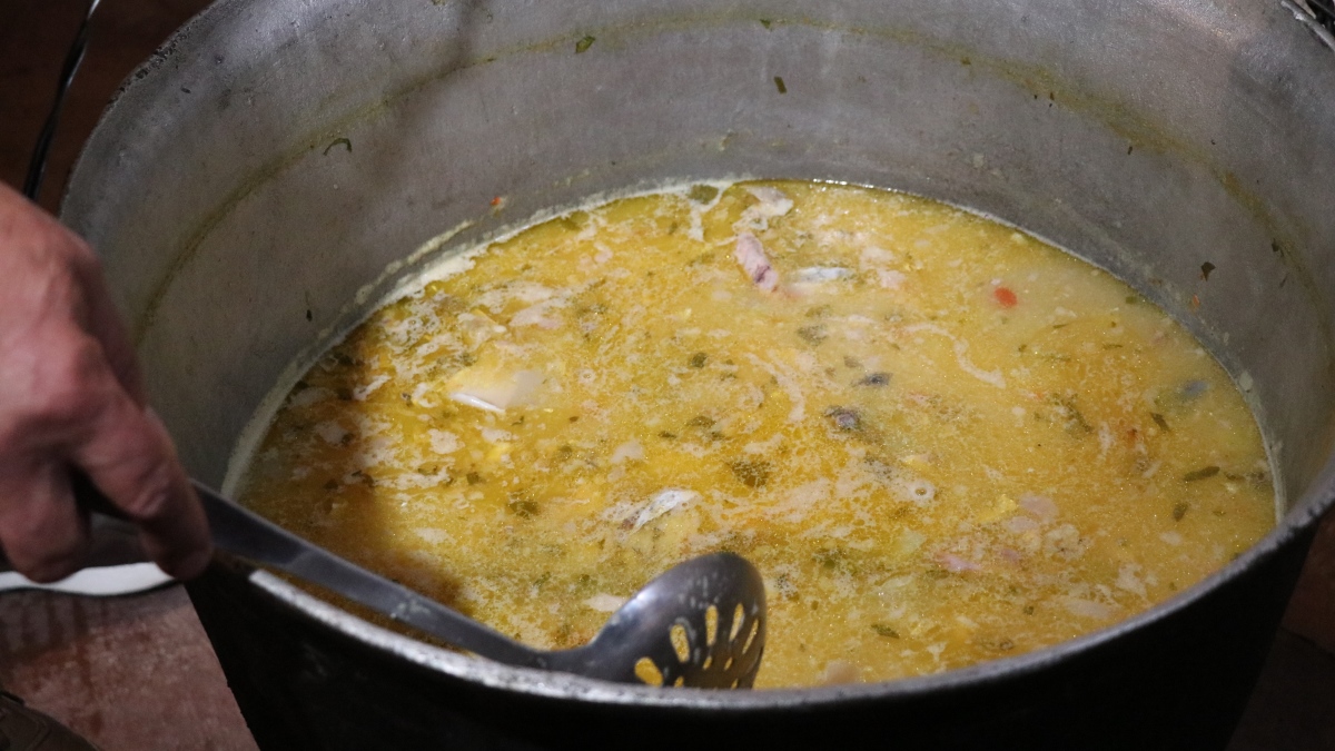 “Am pregătit ciorbă de pește din toate soiurile de pește de la șalău la crap și la speciile mici, ca să ne servim musafirii pe care-i avem cu ocazia hramului comunei Mihai Bravu. Secretul ciorbei este în mâna bucătarului care o pregătește. Pentru un borș bun, trebuie folosit peștele din cât mai multe specii. Am pus și cartofi, ardei, roșii și a fiert cam o oră și jumătate. 120 porții au ieșit în total” spune bucătarul, Simion Zamfir.