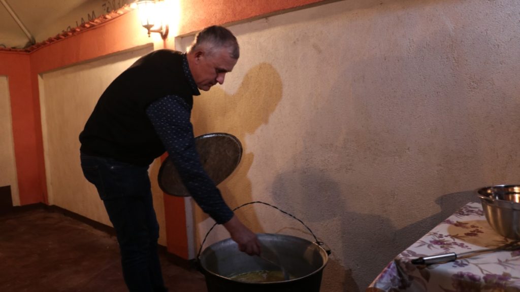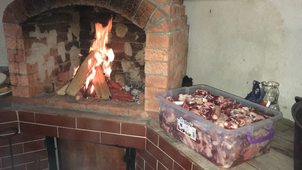 “Asta este o pastramă de berbecuț, adecvată perioadei de toamnă. Carnea a stat la zvântat o noapte, a doua zi am scos-o de pe oase și am condimentat-o cu sare, piper, boia de ardei dulce și usturoi. După aceea am pus-o într-un baiţ făcut din ulei, vin și oțet de mere plus sare, piper și un praf de zahăr. A stat în baiţ trei zile după care am scos-o, am porționat-o și am băgat-o la ceaun. Dincoace avem carne de berbecuţ porționată, condimentată cu sare și piper pe care o punem pe grătar” spune bucătarul Marius Nicușor Chisăr.