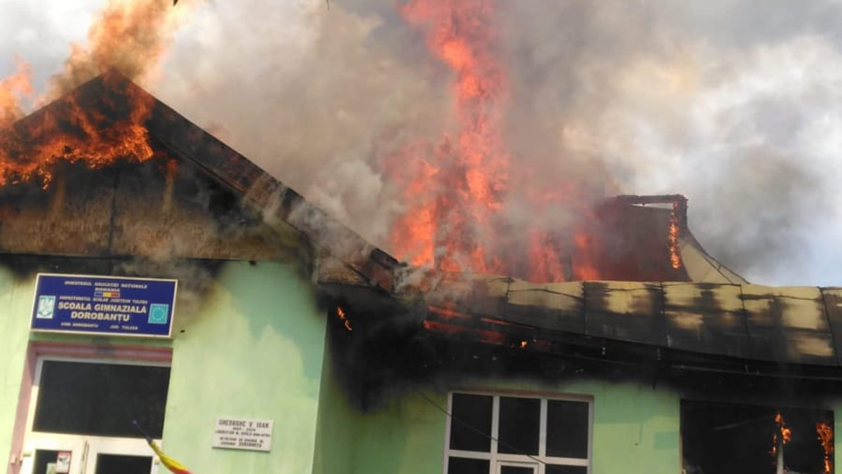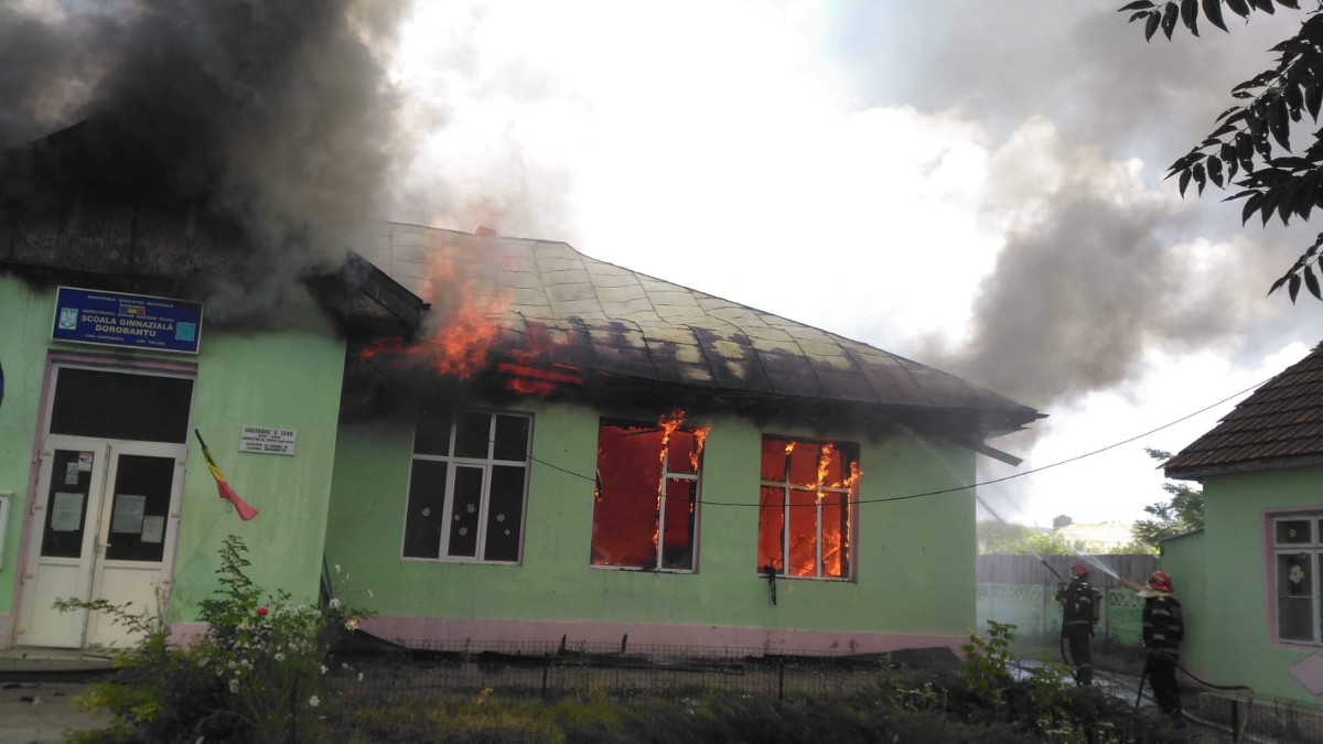 Școala Gimnazială din Dorobanțu s-a făcut scrum duminică după amiază în urma unui incendiu puternic. Două echipaje de pompieri s-au luptat cu flăcările mai bine de două ore.