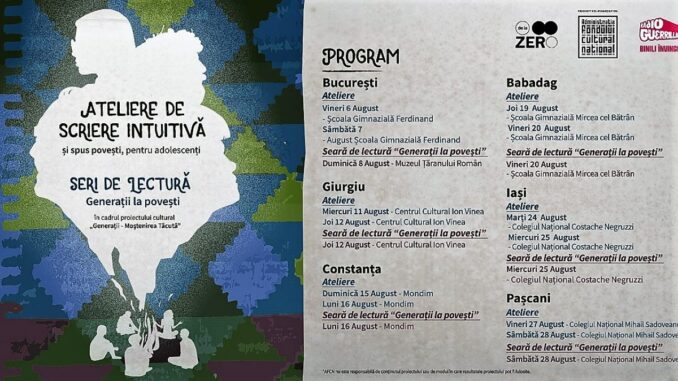 Generații – Moștenirea tăcută cuprinde un spectacol de teatru pe tema moștenirii transgeneraționale, ateliere de scriere intuitivă pentru adolescenți, storytelling și seri de lectură.