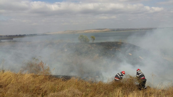 Un incendiu de vegetatie uscata a pus in pericol culturile agricole si casele din Babadag. FOTO ISU Delta Tulcea