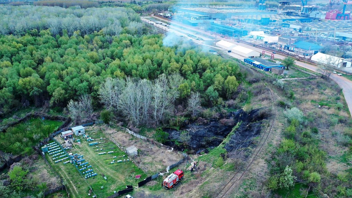 Incendiu de vegetație provocat intenționat, lângă șantierul naval din Tulcea. FOTO ISU Tulcea