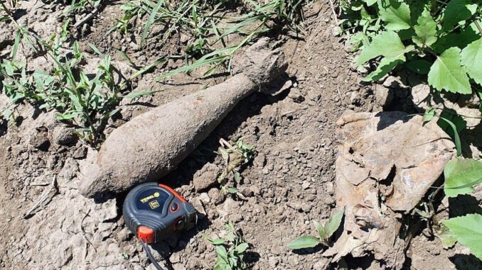 Proiectil de aruncător, găsit pe un câmp de lângă Cataloi. FOTO ISU Tulcea