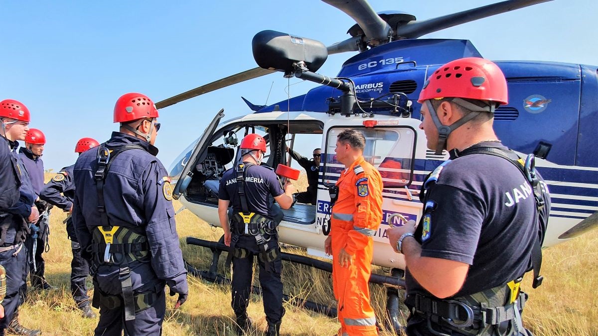 Jandarmii tulceni se antrenează pentru salvarea persoanelor cu ajutorul elicopterului. FOTO IJJ Tulcea