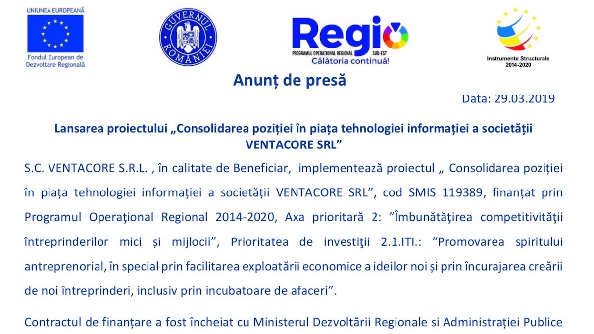 Ventacore Regio Lansarea proiectului “Consolidarea poziției în piața tehnologiei informației a societății VENTACORE SRL”