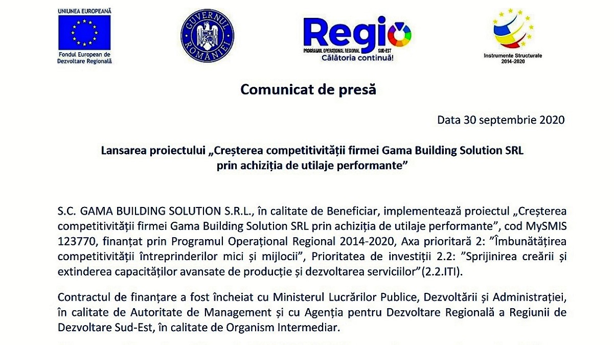 Untitled Lansarea proiectului „Creșterea competitivității firmei Gama Building Solution SRL prin achiziția de utilaje performante”