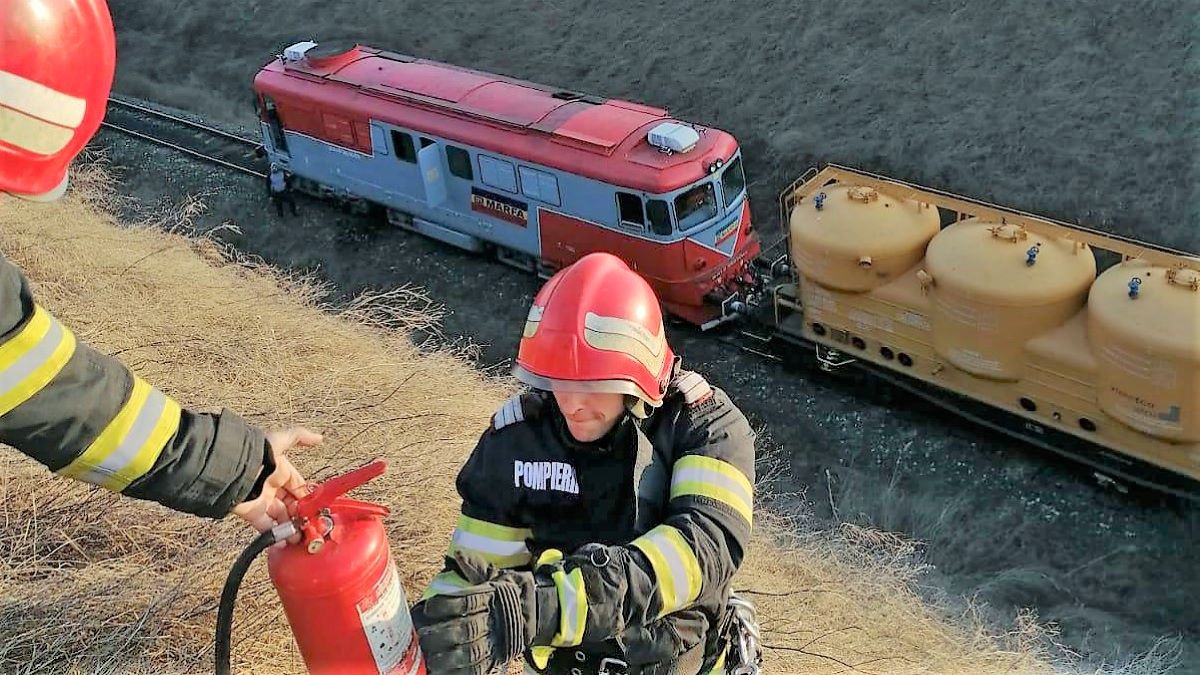Locomotivă cuprinsă de flăcări în zona podului Cataloi. FOTO ISU Tulcea