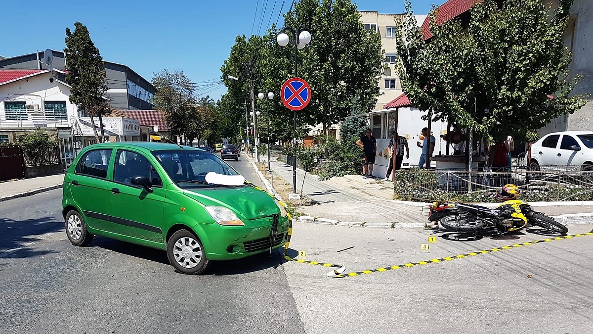 Motociclist rănit după ce a fost acroșat de un autoturism, în Măcin. FOTO IPJ Ialomița