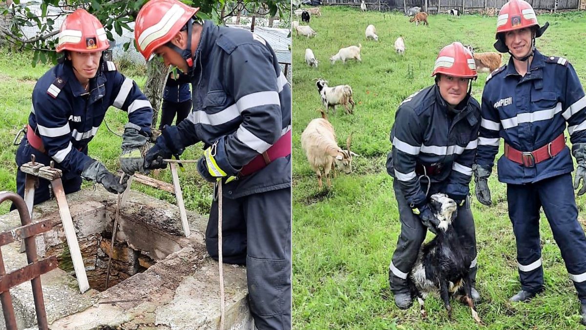 Pompierii tulceni au salvat o capră ce căzuse într-o fântână dezafectată din Ceamurlia de Sus. FOTO ISU Tulcea