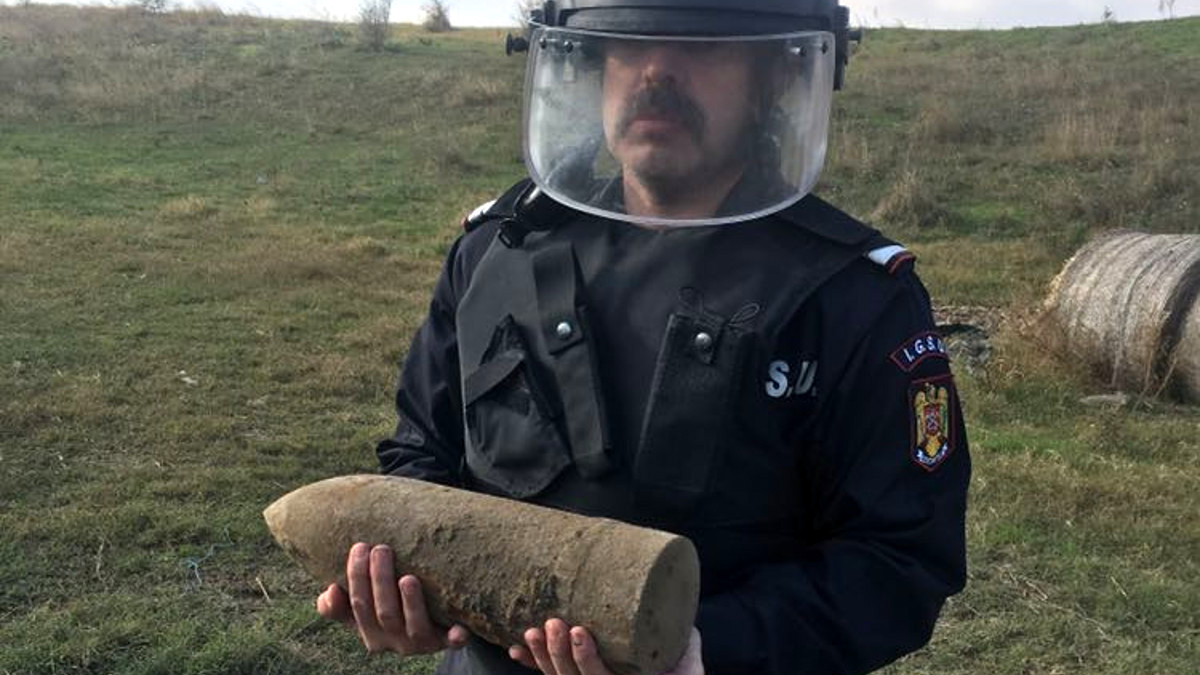 Proiectil gasit pe camp preluat de pompieri pirotehnist (4) Proiectilul de tun a fost preluat de pompierii pirotehniști. FOTO ISU Delta Tulcea