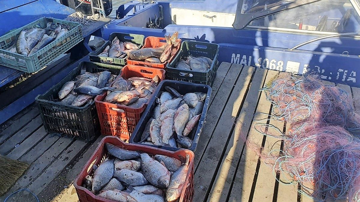 Sute de kilograme de pește și un kilometru de plase mono-filament, scoase din lacul Sinoe. FOTO: Garda de Coastă