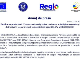 Anunturi Finalizarea proiectului „Crearea unei unități noi de realizare a activităților recreative și distractive în scopul creșterii competitivității societății AFV MEDIA SERV SRL” March 23, 2021 Cătălin LEGĂNEL