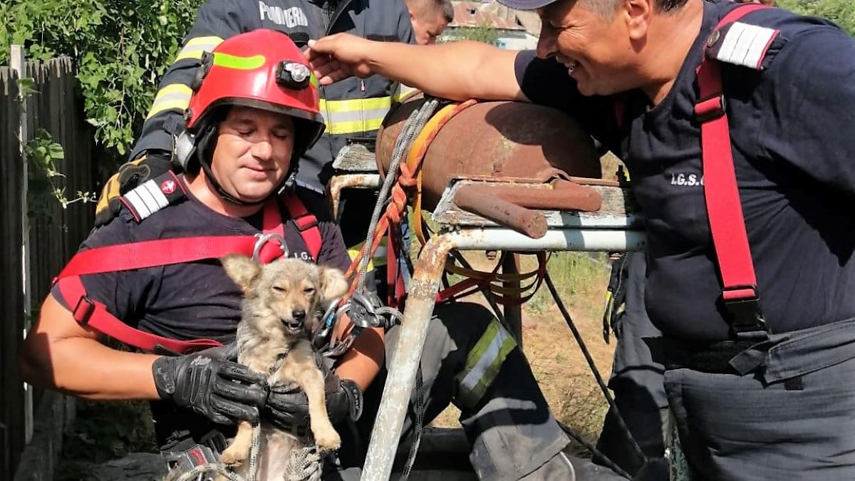 Un câine căzut într-o fântână din Beștepe, salvat de pompieri. FOTO ISU Tulcea