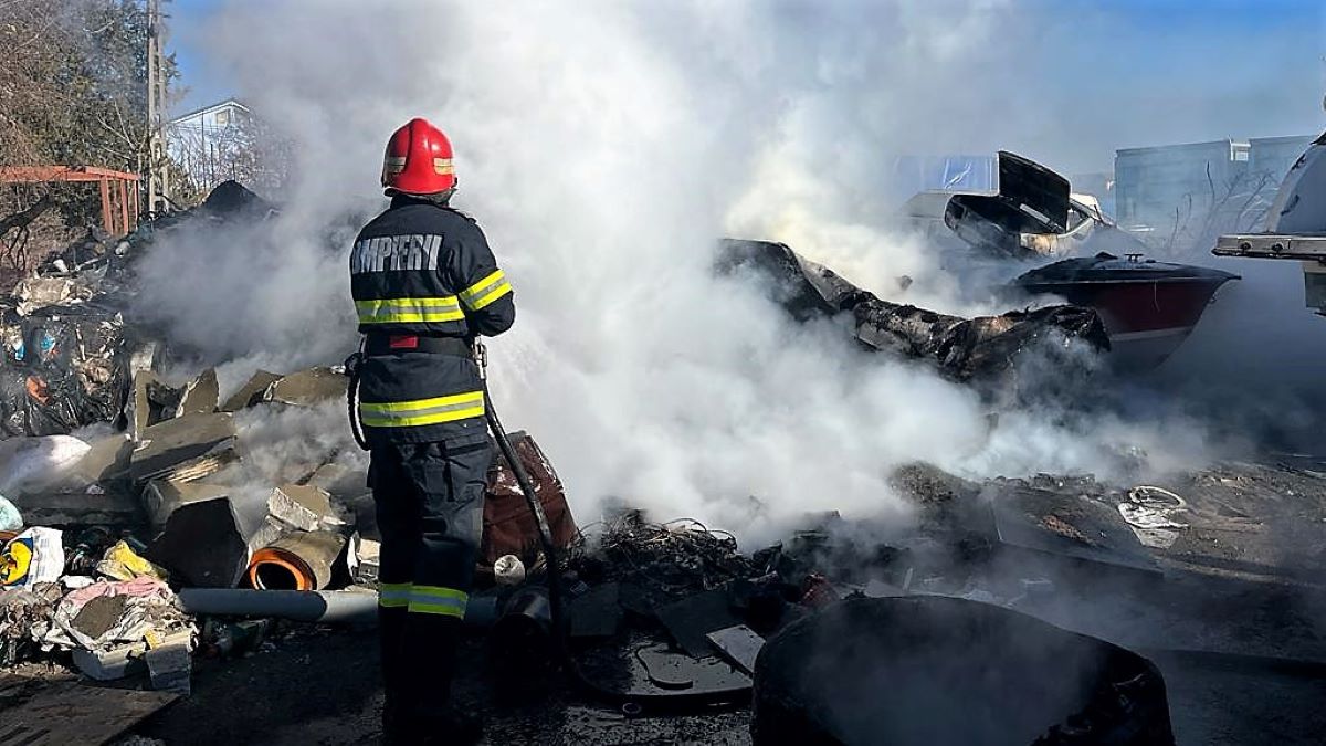 Ambarcațiuni distruse într-un incendiu pe strada Energiei din municipiul Tulcea. FOTO ISU Tulcea