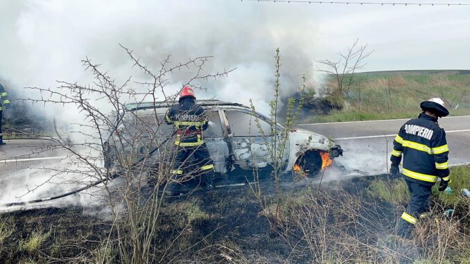 Autoturism cuprins de flăcări pe DJ 222, la ieșirea din Nufărul. FOTO ISU Tulcea