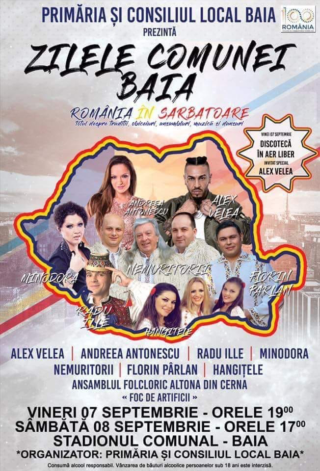 Toată suflarea comunei Baia s-a adunat în serile zilelor de 7 și 8 septembrie 2018 pe stadion la sărbătoarea localității. În fumul grătarelor și în sunetul muzicii, pe dansuri populare și cu mult vin și bere, oamenii au petrecut până aproape de miezul nopții. Pe scena de spectacol au urcat Alex Velea, Minodora, Radu Ile, Ansamblul ALTONA, formația Haiducii și duetul de cântărețe populare Hangițele. Ultima seară de sărbătoare fost una de pomină pe care localnicii nu o vor uita prea curând.