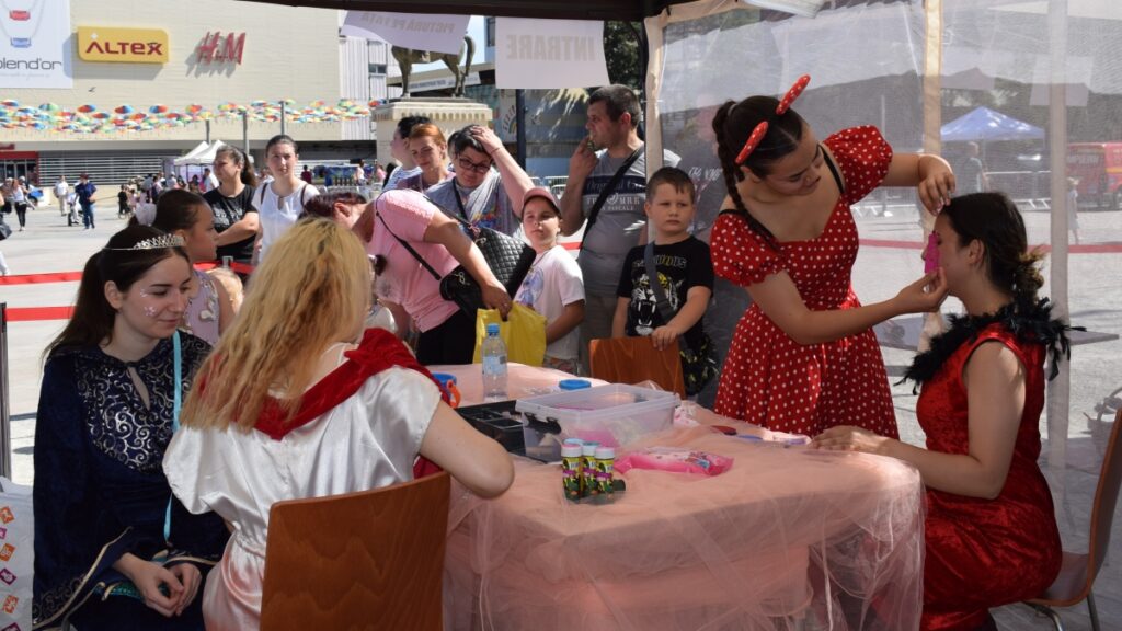 Sutele de copii care au venit să sărbătorească Ziua de 1 Iunie în Piața Civică a orașului s-au bucurat de nenumărate activități deosebite, de la pictură pe față cu steluțe, zâne și ursuleți, până la ateliere de prim-ajutor și un perete de escaladă.